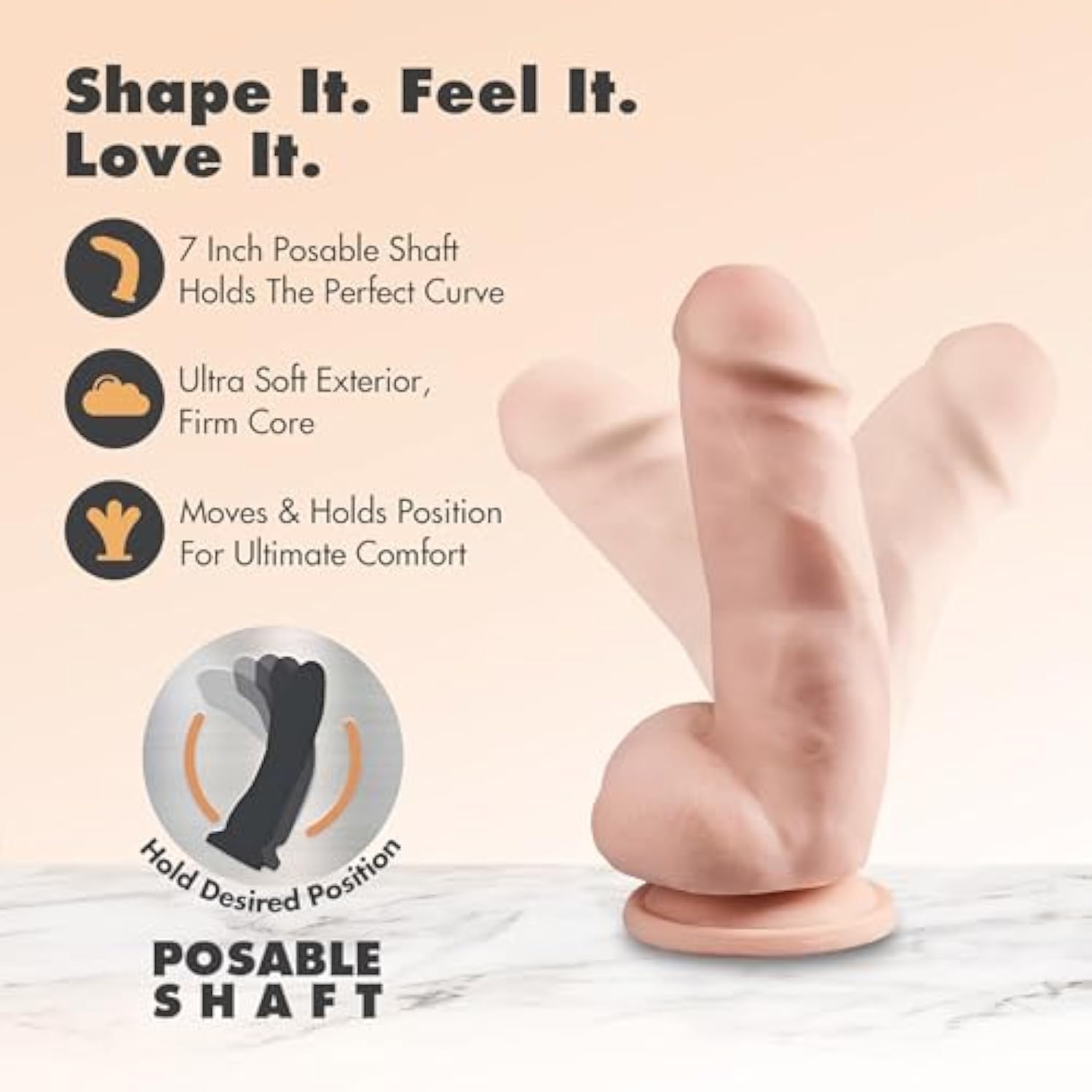 Blush Dr. Skin Plus 7" Realistic Dildo - Posable Girthy Penis W/Balls - Triple Density, Suction Cup, Strap-On Compatible, Lifelike Anal Or Vaginal Cock Sex Toy For Women, Men & Couples - (Vanilla)