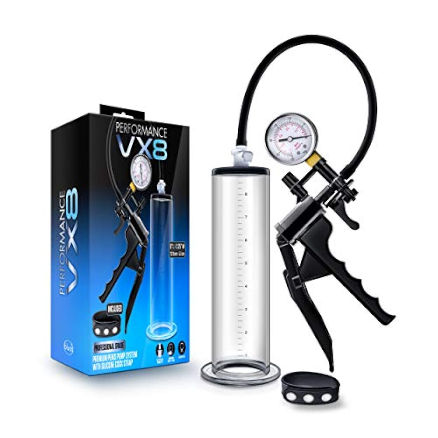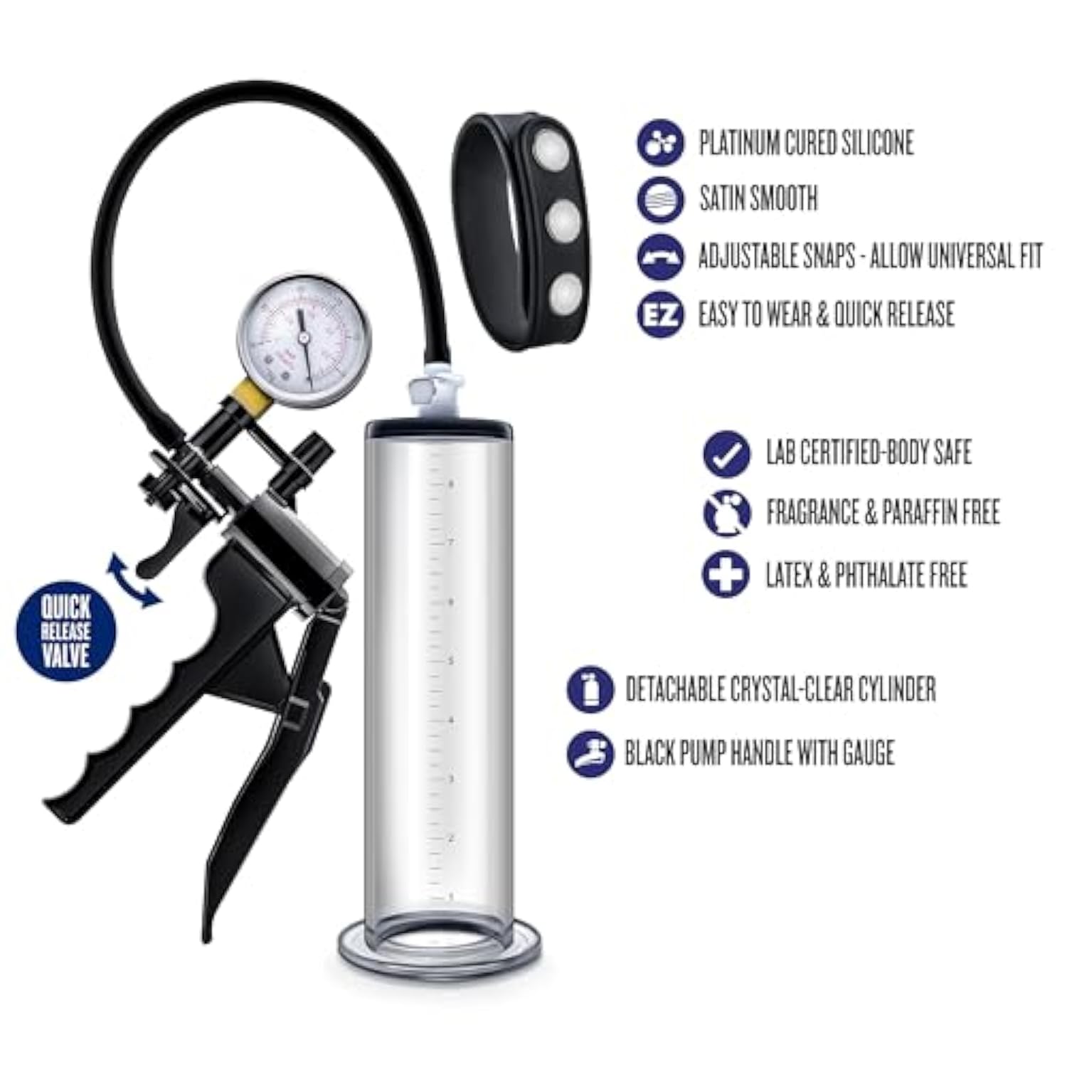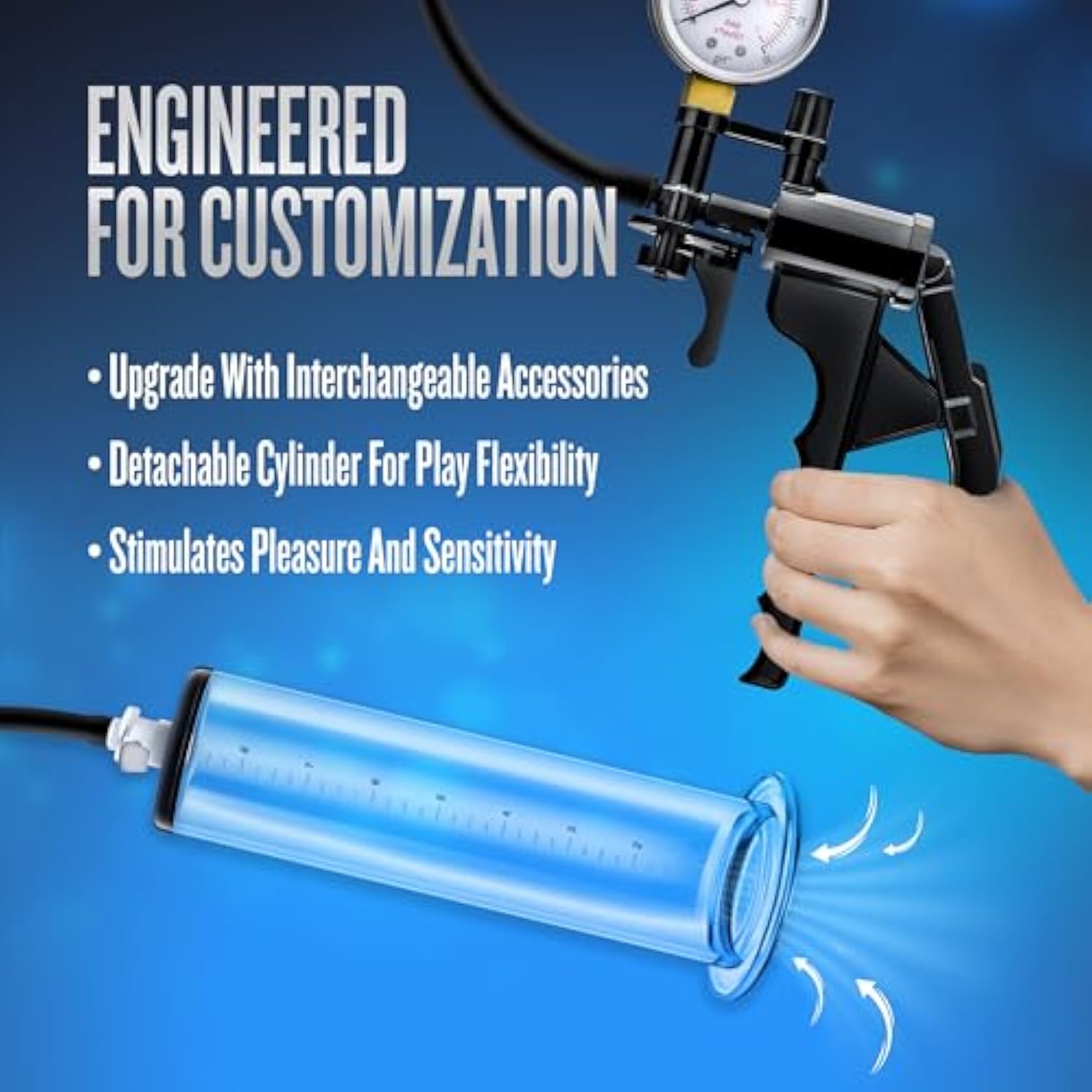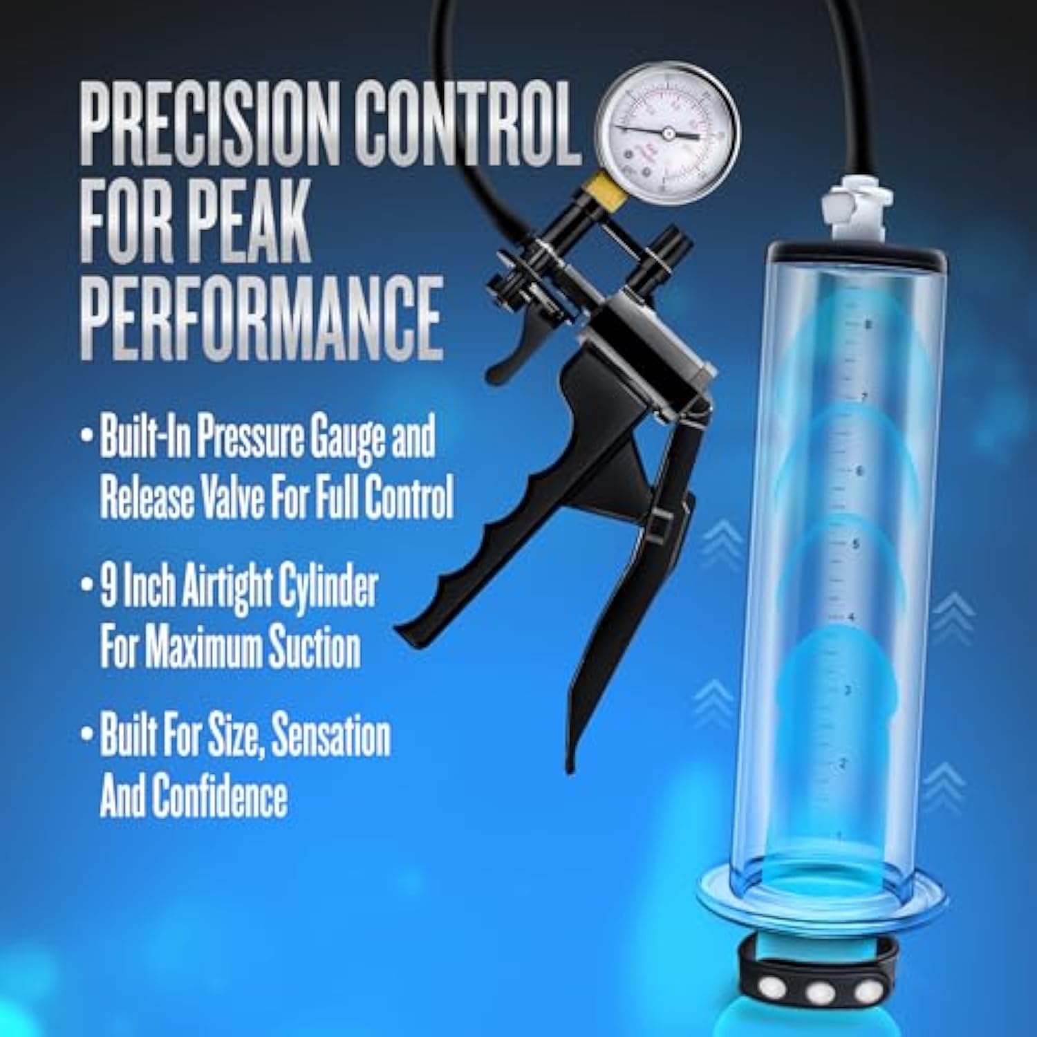 Blush Sex Toys- Male Performance Enhancement Vx8 Penis Pump 9.5" Cylinder, Silicone Strap, Gauge & Trigger Handle - Quick-Release Valve - Nterchange Compatible Pro-Grade Cock Size Extender Men Sex Toy