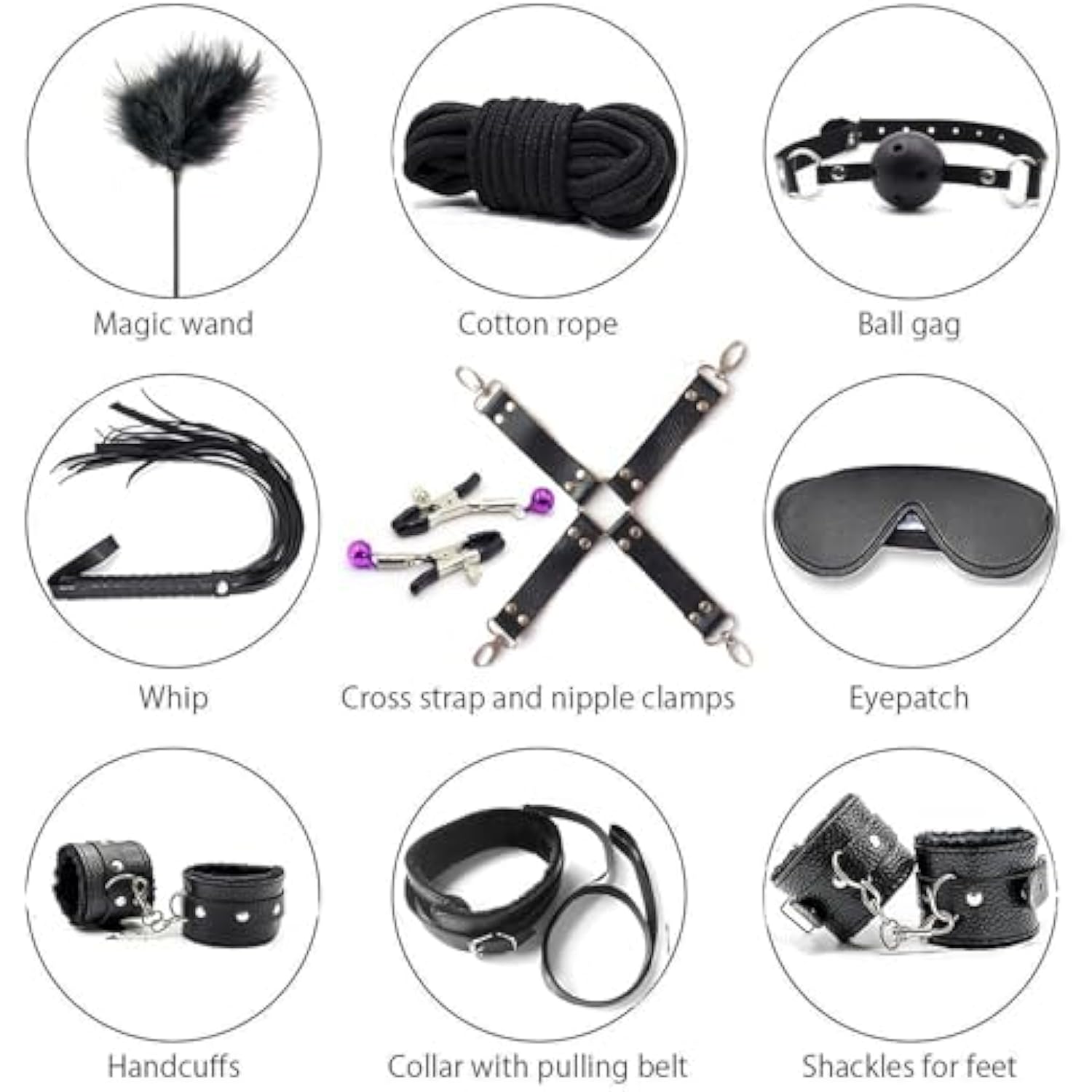 - ???Sm 10 Piece Set?Set Includes Sexy Handcuffs, Bdsm Restraints, Whip, Cotton Rope, Gag, Nipple Clamps, Spring Bars, Collar, Cross Strap, Blindfold. Hot And Diverse Sm Products! Combine Them With A Variety Of Sm Toys And Let Your Imagination Run Wild. T