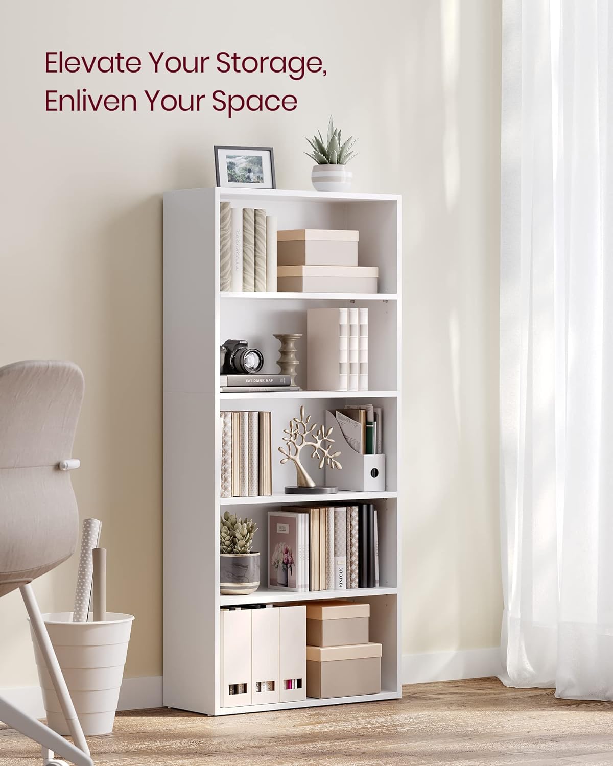 - [Spacious] This 5-tier bookcase sized 9.4"D x 23.6"W x 52.7"H utilizes vertical space to display your favorite books or special treasures. This keeps them easily accessible in the living room, study, or bedroom