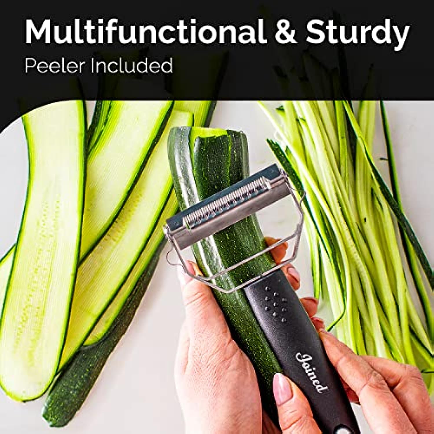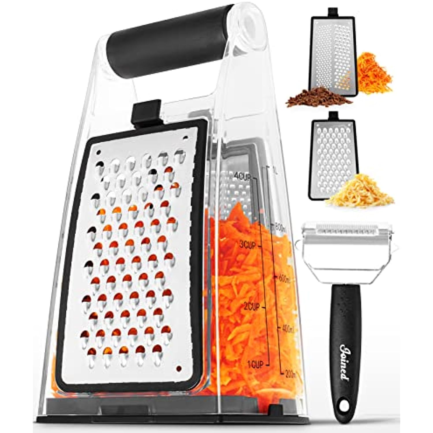 - More Than A Food Shredder And Peeler. Includes 3 different grating surfaces, removable non-slip base, 2 different measurement units, a thick and comfortable handle, and an additional vegetable peeler. This versatile kitchen gadget will streamline your cooking by multitasking as a ginger grater, carrot shredder, parmesan cheese grater and much more.
