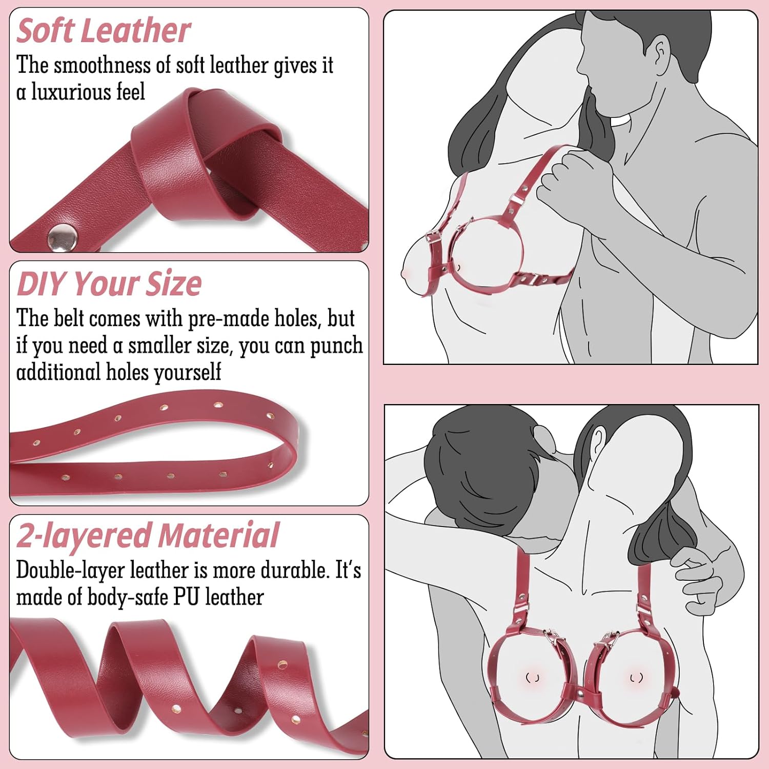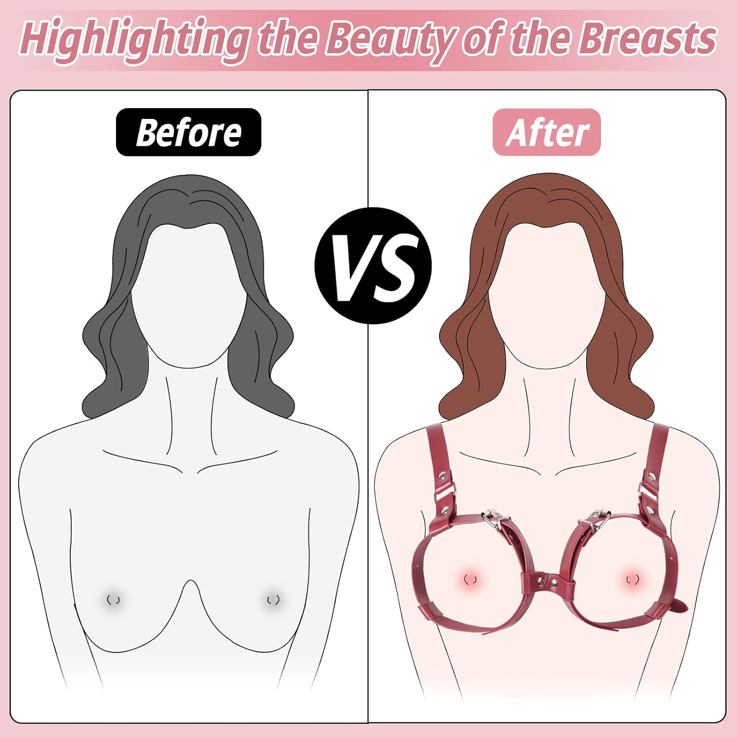 - SIZE: The breast straps can be adjusted from 10.5 to 20 inches in length. The underbust straps can be adjusted from 23.6 to 32.3 in length. The shoulder straps can be adjusted from 16 to 22 inches in length. This sex harness enables you to adjust the tightness for effectively enhancing and binding the breasts, resulting in more intense sensations for the wearer.