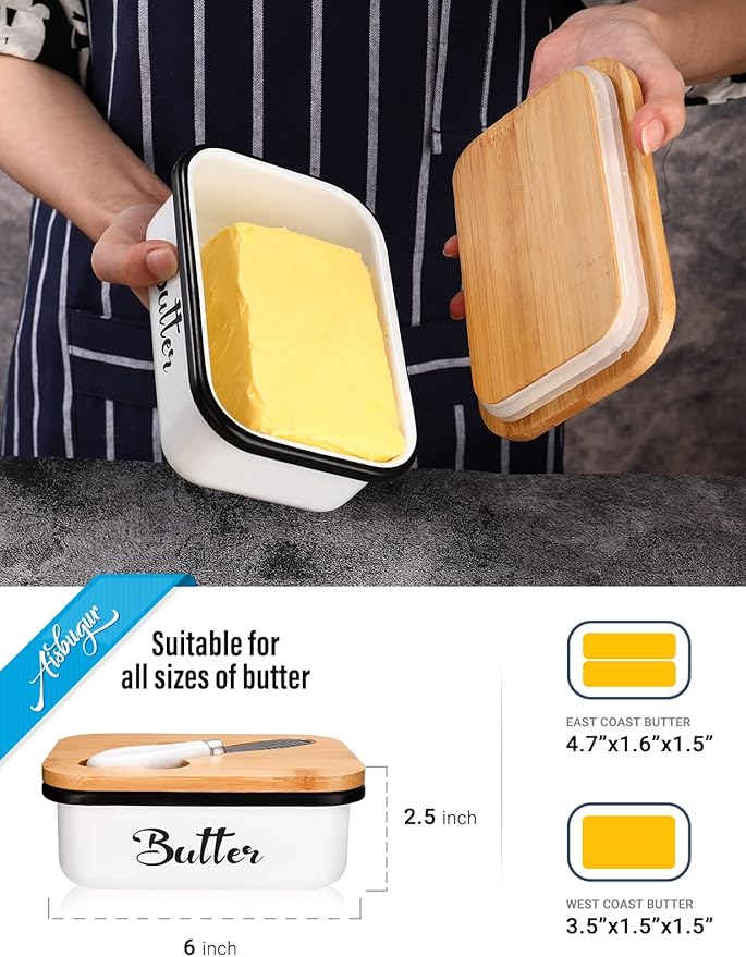 - Durable Butter Dish with Lid for Countertop: This butter dish with lid for countertop made of metal material that more durable and much lighter than ceramic, which can effectively prevent slipping from your hands. The butter dish with lid size is 3.5*5.5*2in, this butter dish is wide and deep enough to hold various of butter.