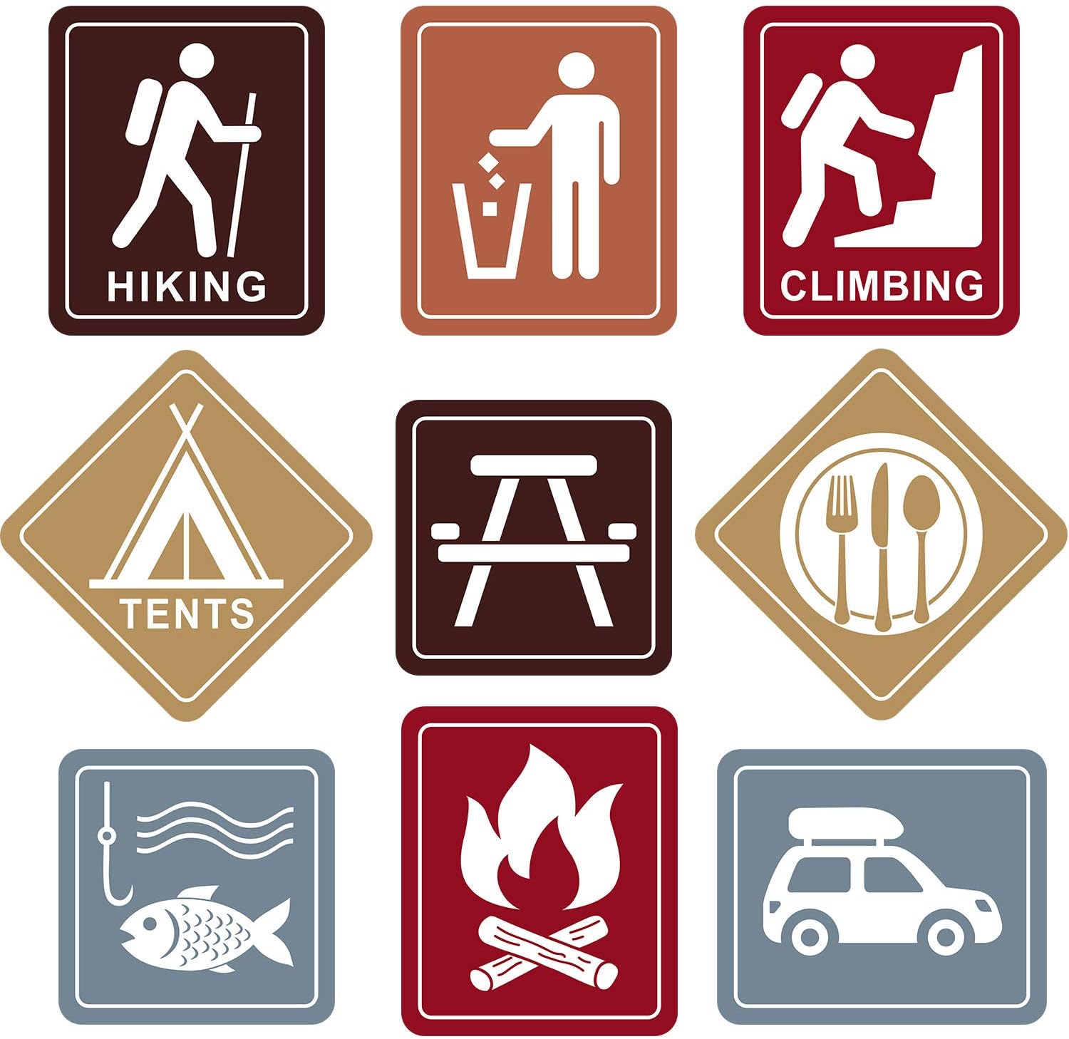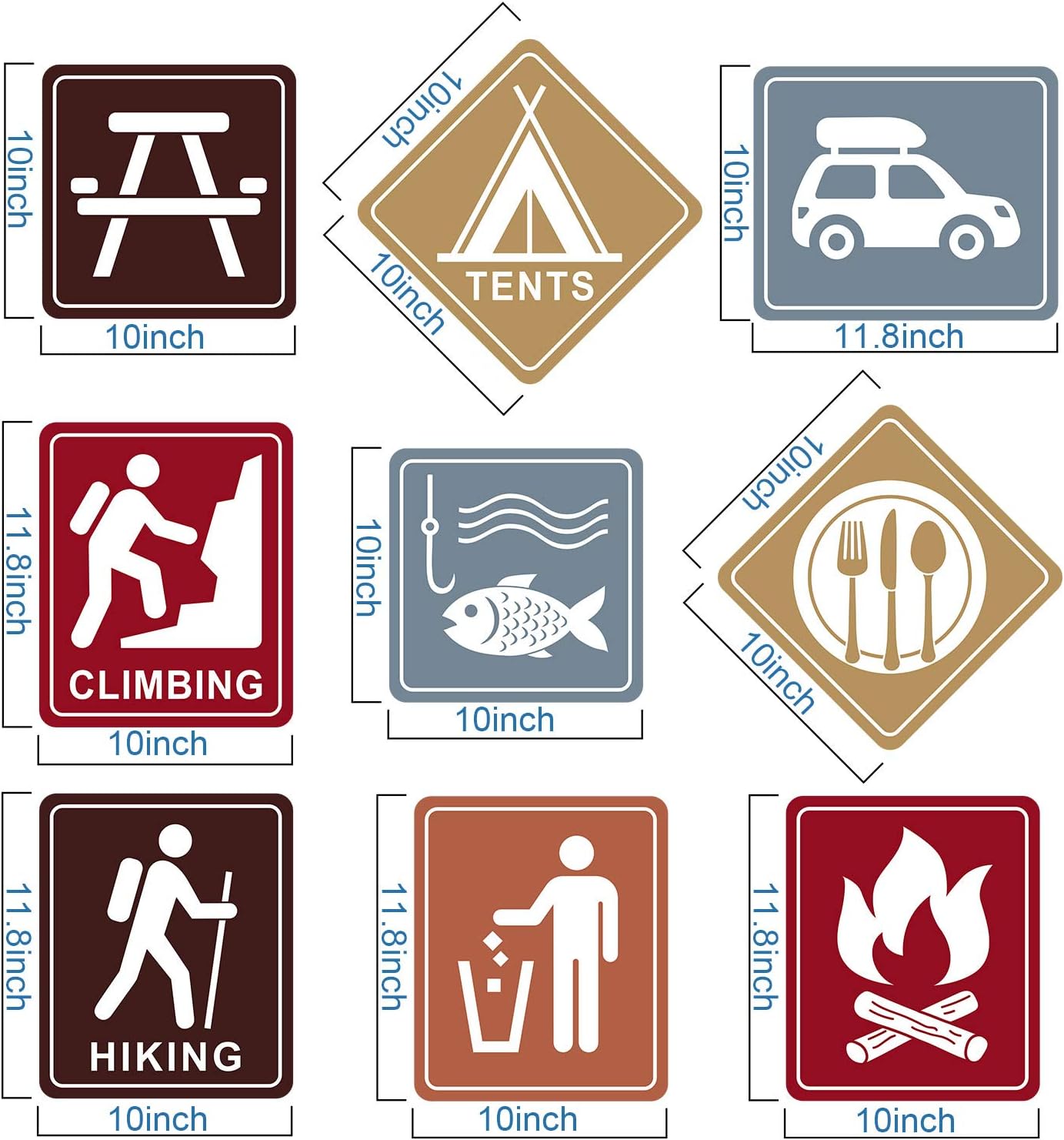 - Package includes: 9 pieces camping signs cutouts with 40 pieces glue points, each cardboard features icons for fishing, hiking, eating, picnic tables, tents, campfire, climbing, trash and car; These camp sign cutouts are great ways to help guide the kids to fun games or activities