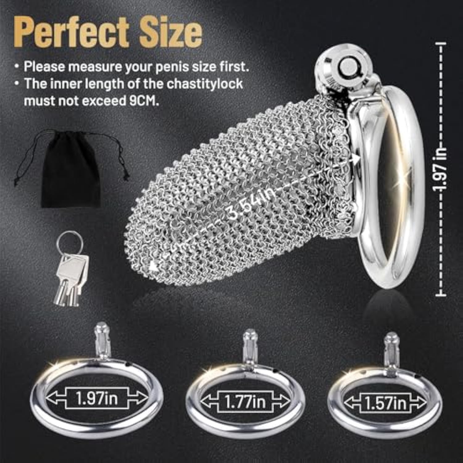 | Flexible Metal Chastity Cage: The Male Chastity Cage Is Made Of High-Quality Stainless Steel, Its Soft Metal Braid Is Comfortable To Wear And Good Ventilation. You Will Not Feel Uncomfortable Even If You Wear It For A Long Time | | Sizes To Meet Most People: Our Chastity Ring Comes In Three Sizes - 1.57 Inches/1.77 Inches/1.97 Inches, Please Choose According To Your Preference. The Package Includes 1 X Bottom Ring, 1 X Cage, 1 X Lock And 2 Keys | | Bondage Sense: The Mesh Design Chastity Cage Is Suitable For Daily Use.The Ultimate Tease Makes You Eager To Feel The Pleasure Of Perfect Release. Any Couple'S Bdsm Sex Toys Should Not Lack It.This Male Penis Device Fits Very Well, Which Also Means You Can Take It With You | | Safety And Waterproof: The Chastity Device Adopts An Ergonomic Design. The Chastity Cage Comes With A Lock Core, Saving Time And Effort, Which Will Not Rust And Is Easy To Clean | | Privacy : Our Penis Ring And Chastity Cage Set Will Be Packaged In Black Flannel, And Product Information Will Not Be Displayed In The Package | |