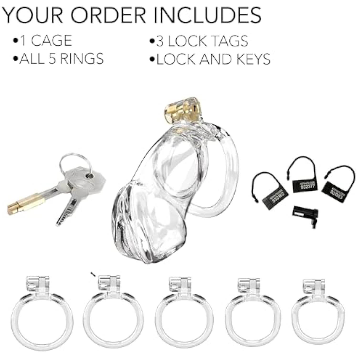 Chastity Device, Fully Enclosed Male Chastity Cage With Female Design, Nylon Resin Plastic Chastity Device, 3D Printed, Includes 5 Rings (Clear, Small)