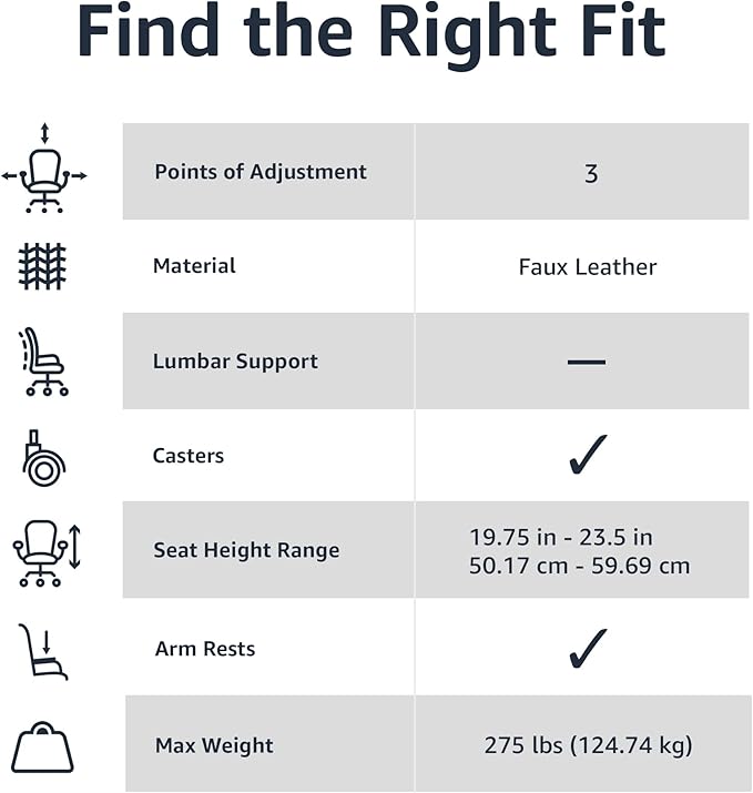 Classic Puresoft PU Padded Mid-Back Height Adjustable Office Computer Desk Chair with Armrest, 26"D x 23.75"W x 42"H, Black