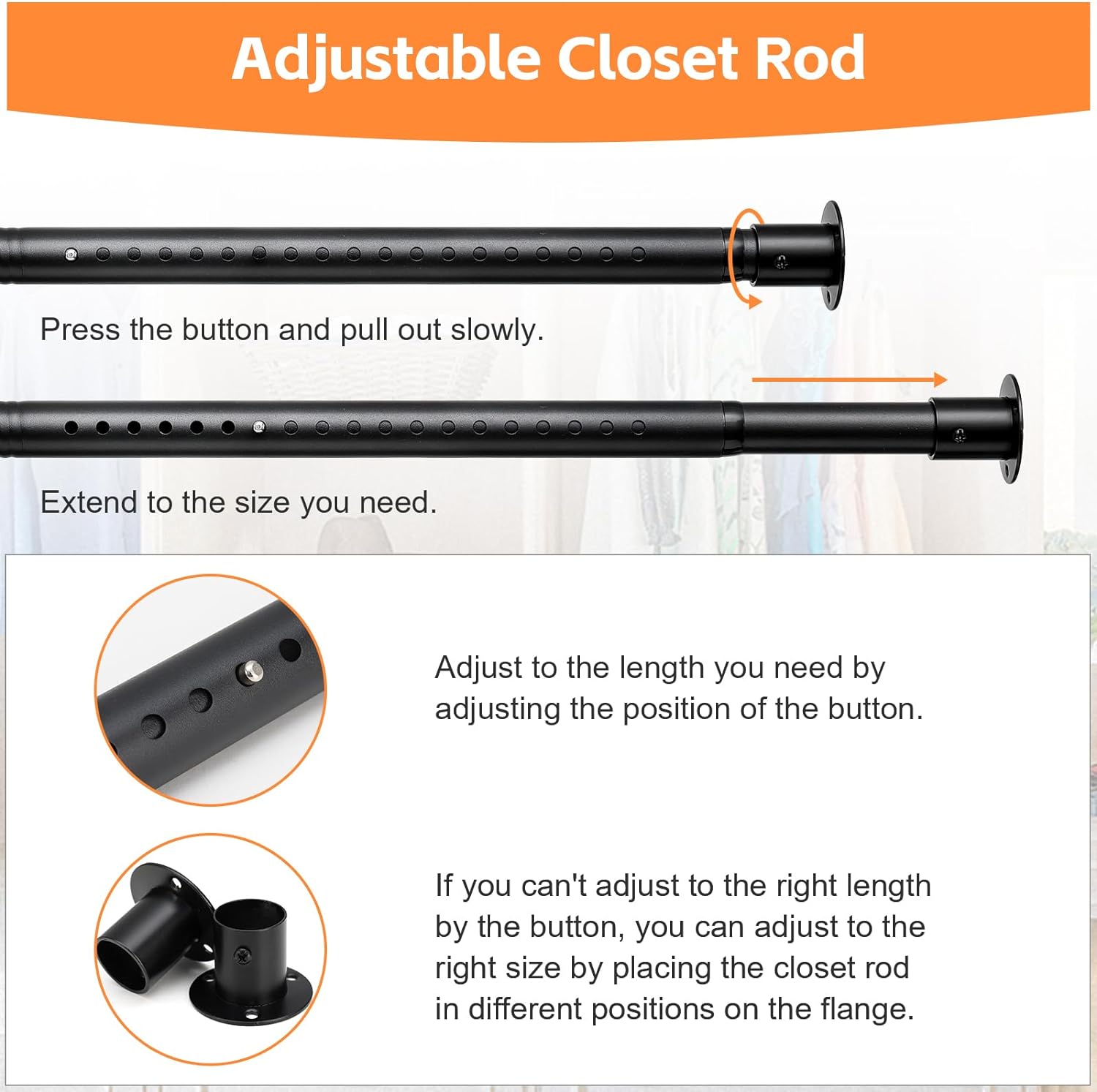 - Adjustable Closet Bar: The closet rods for hanging clothes is adjusted by splicing and buttons, which you can adjust to the right size according to your needs.
