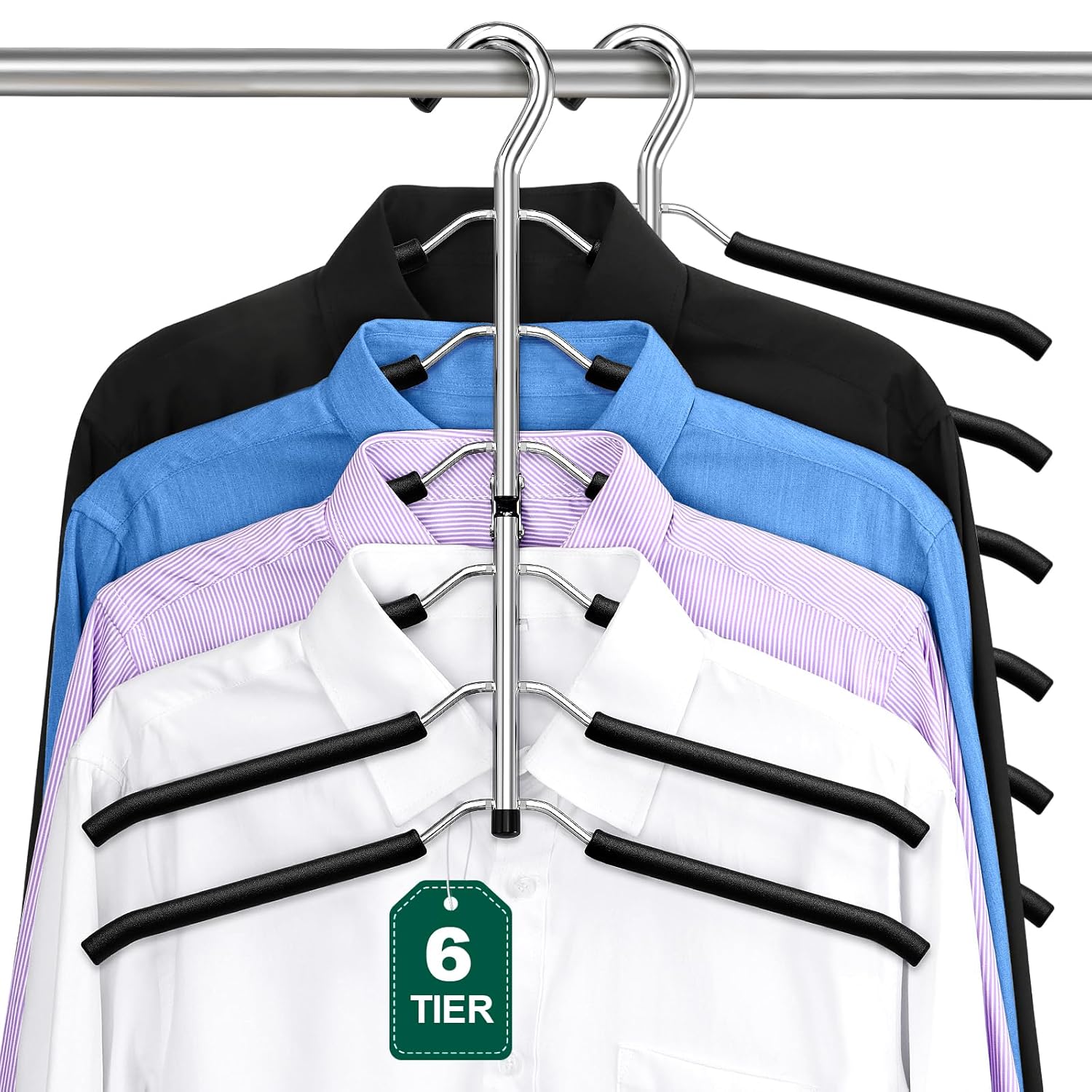 Clothes Hangers Space Saving - 6 Tier Coat Hangers Space Saving Hangers Non Slip Foam Padded Hangers, 2 Pack Black Metal Sweater T Shirt Hangers for Men Women, Closet Organizers and Storage