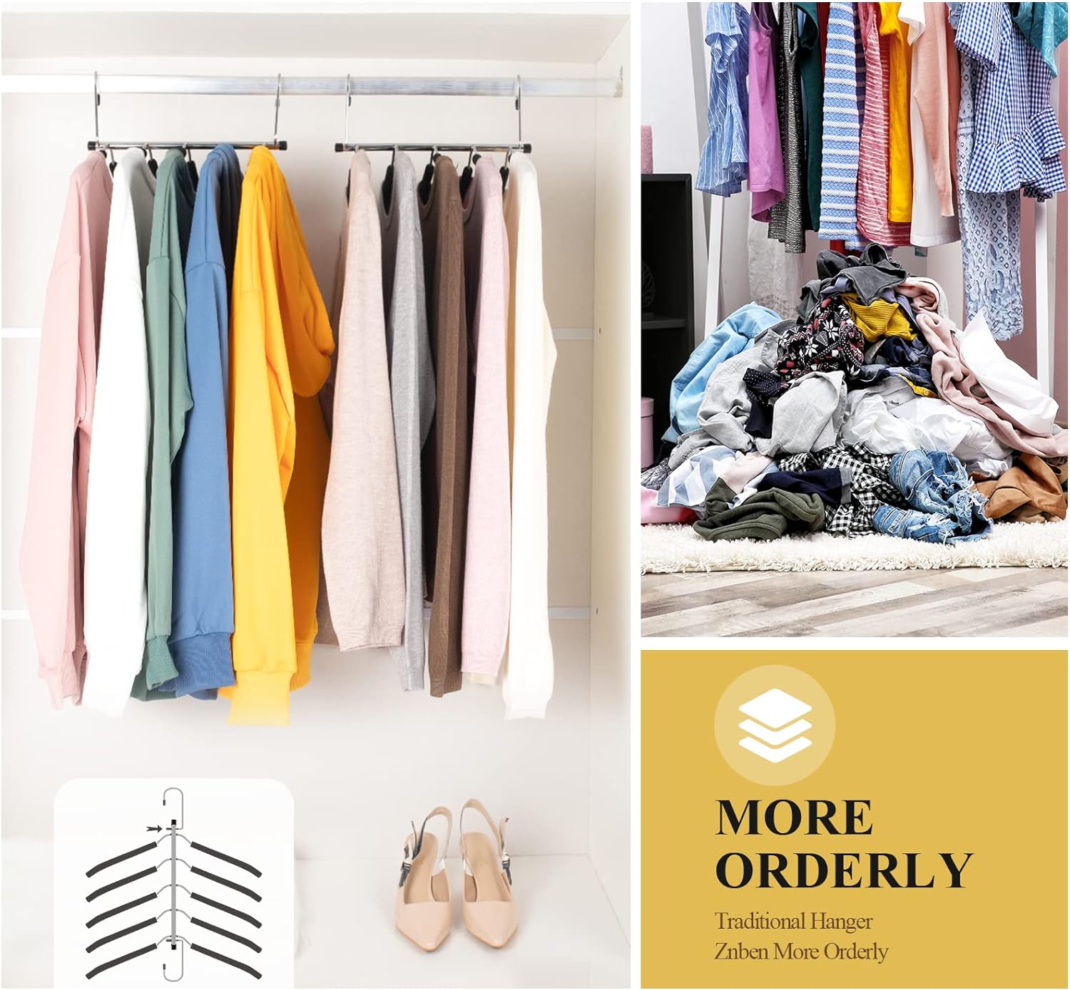 - Space Saving Hangers: 5 tier shirt hangers can hang 5 clothes at same time, freeing up to 85% of the space. Make a crowded wardrobe tidy, leave more space for your wardrobe and keep your clothes orderly, classify different types of clothes to make it easier to find your clothes.
