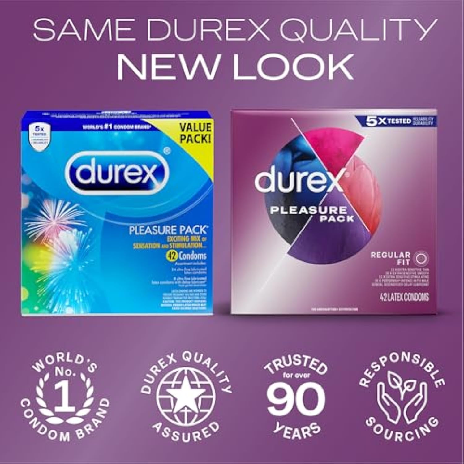 | DUREX CONDOM PLEASURE PACK: Features 4 types of assorted lubricated, natural latex male condoms including Extra Sensitive condoms and Performax Intense condoms | | ENHANCE: These lubricated male condoms are designed to enhance sex for both you and your partner | | PERFORM: Durex Performax Intense delay condoms for men are made with a desensitizing lubricant to help slow him down and last longer: Benzocaine 5 percent | | EXCITE: Durex Extra Sensitive ultra thin condoms with extra lubrication give you the intimate feeling of skin on skin