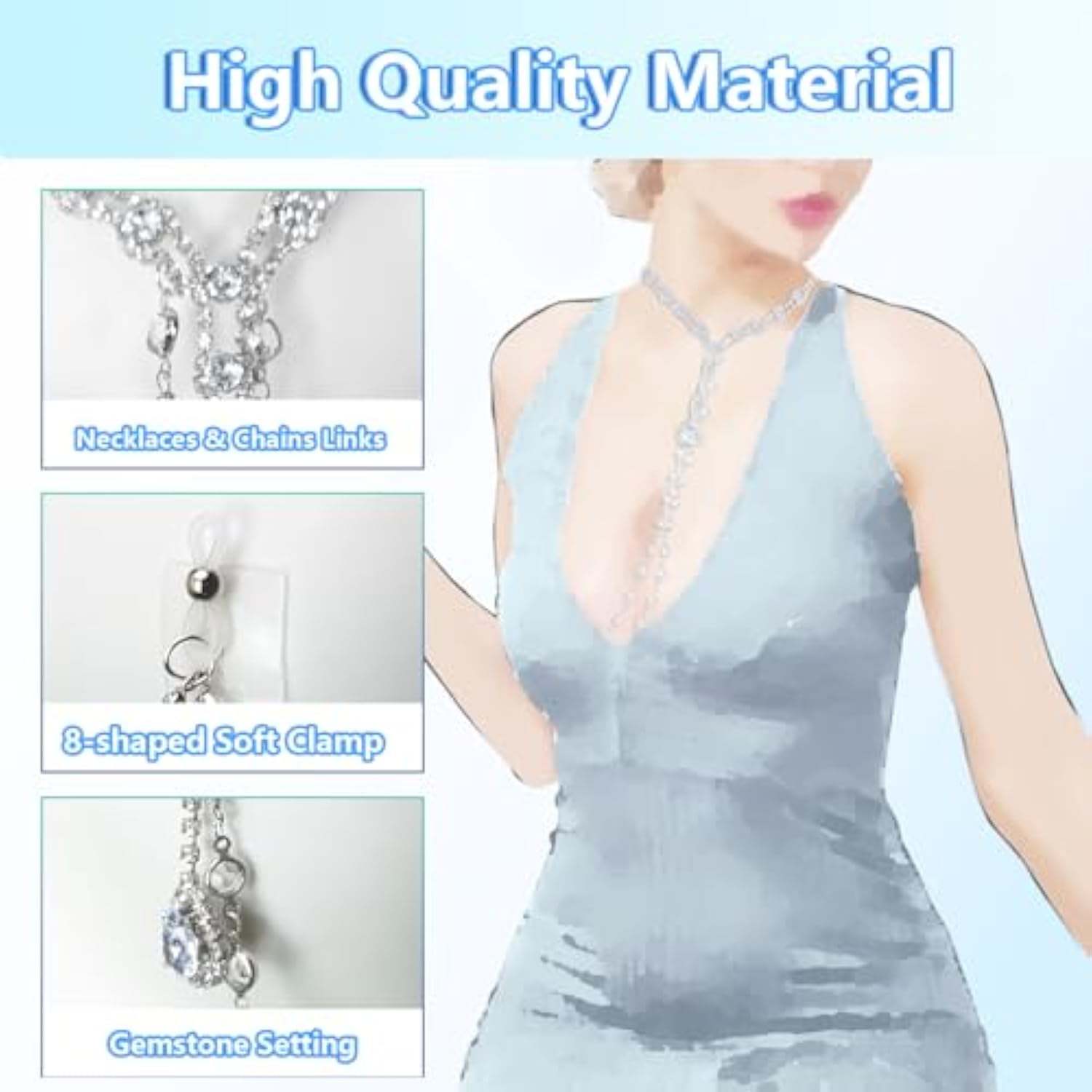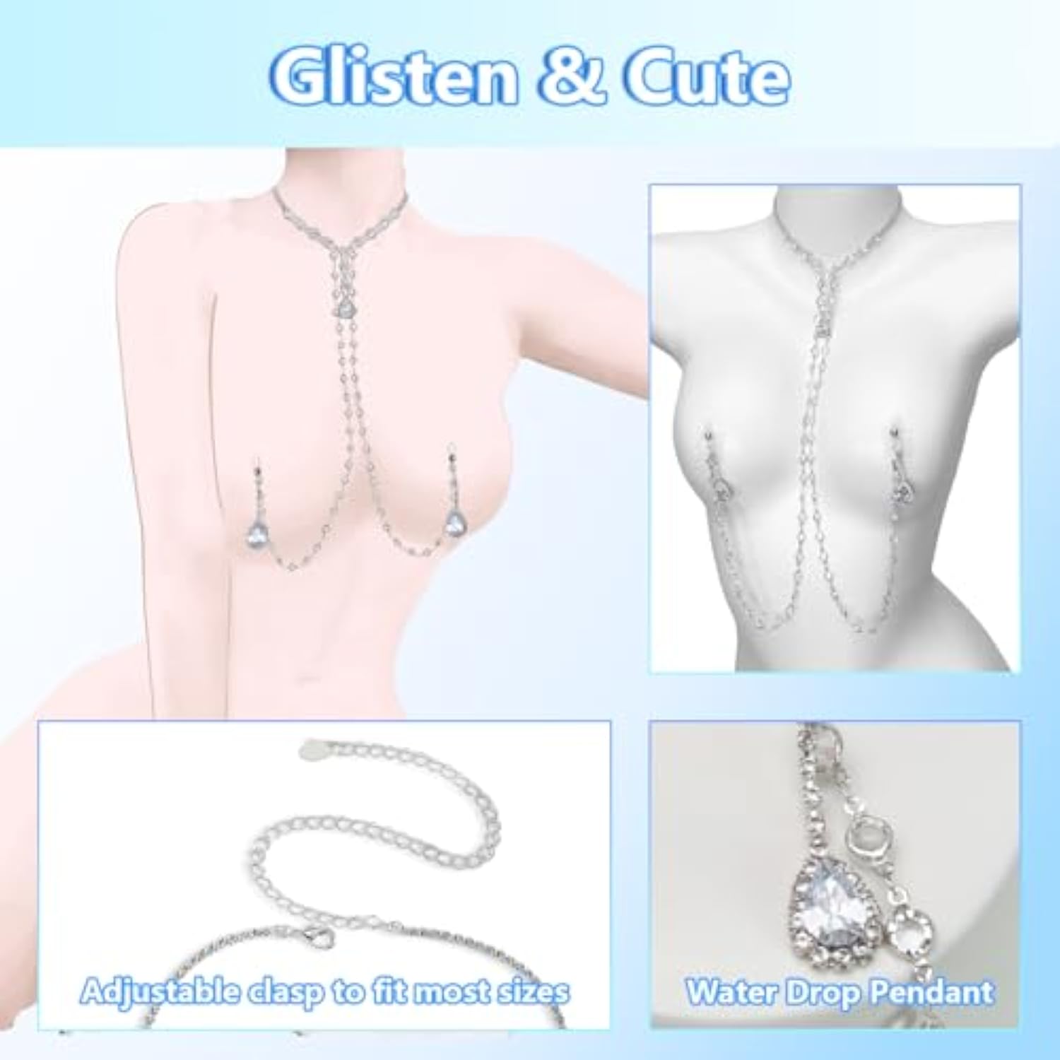 Crystal Body Chain Necklace Set With Rhinestone Pendants, Body Clamps Breast Silver Chain W-Tone Fashion Jewelry For Women (Concise-Wathet)