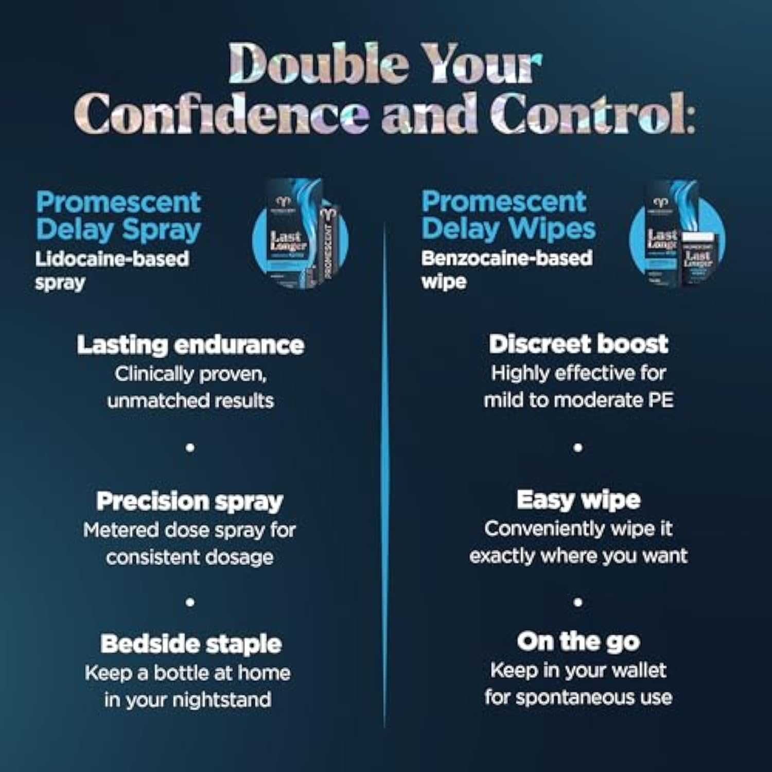 | Perfect Bundle: Experience Enhanced Pleasure And Prolonged Intimacy With Delay Spray (2.6 Ml) And Delay Wipes (7 Count) | | Longer Sex: Use Delay Spray For Him 5-10 Minutes Before Intimacy To Control Premature Ejaculation | | Delay Wipes: An Advanced Benzocaine Formula Allowing Men Greater Sense Of Control | | Delay Wipes: Unlike Other Numbing Lube, Delay Condoms, Spray, Or Sex Pills Our Swipes Are Simple To Apply | | Highly Regarded: , A Trusted Sexual Welness Brand Elevates Couples' Sexual Experiences, Has Earned Substantial Trust And Endorsement From The United States Healthcare Community, Backed By Recommendations From Over 4,000 Healthcare Professionals. | |