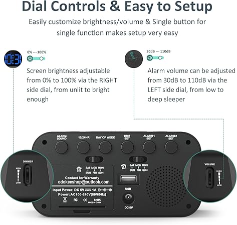 - EASY TO SETUP & 0-100% DIMMABLE DISPLAY - All buttons do one task and are clearly labeled makes setting the time or alarm extremely intuitive and straightforward. Large easy to read blue LED digits(1.6-inch tall) that can be easily viewed from a distance and the brightness can be easily adjusted from very bright to fully dark with the simple dimmer dial, which is nice for sleeping so you don't have a bright light in the room. 12 or 24 hour time display optional.
