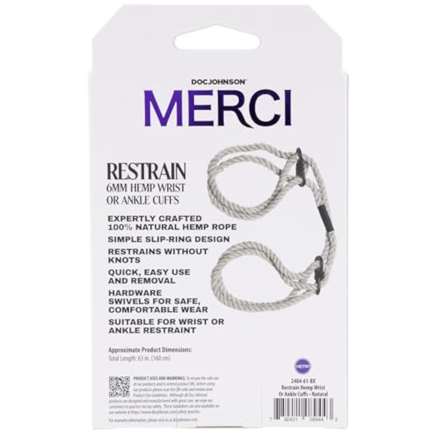 | Approximate Product Dimensions: Wrist Ankle Cuffs; Total Length: 63 in. (160 cm) | | Expertly Crafted 100% Natural Hemp Rope | | Simple Slip-Ring Design Restrains Without Knots | | Quick, Easy Use and Removal | | Hardware Swivels for Safe, Comfortable Wear | Suitable for Wrist or Ankle Restraint | For Adults Only | |