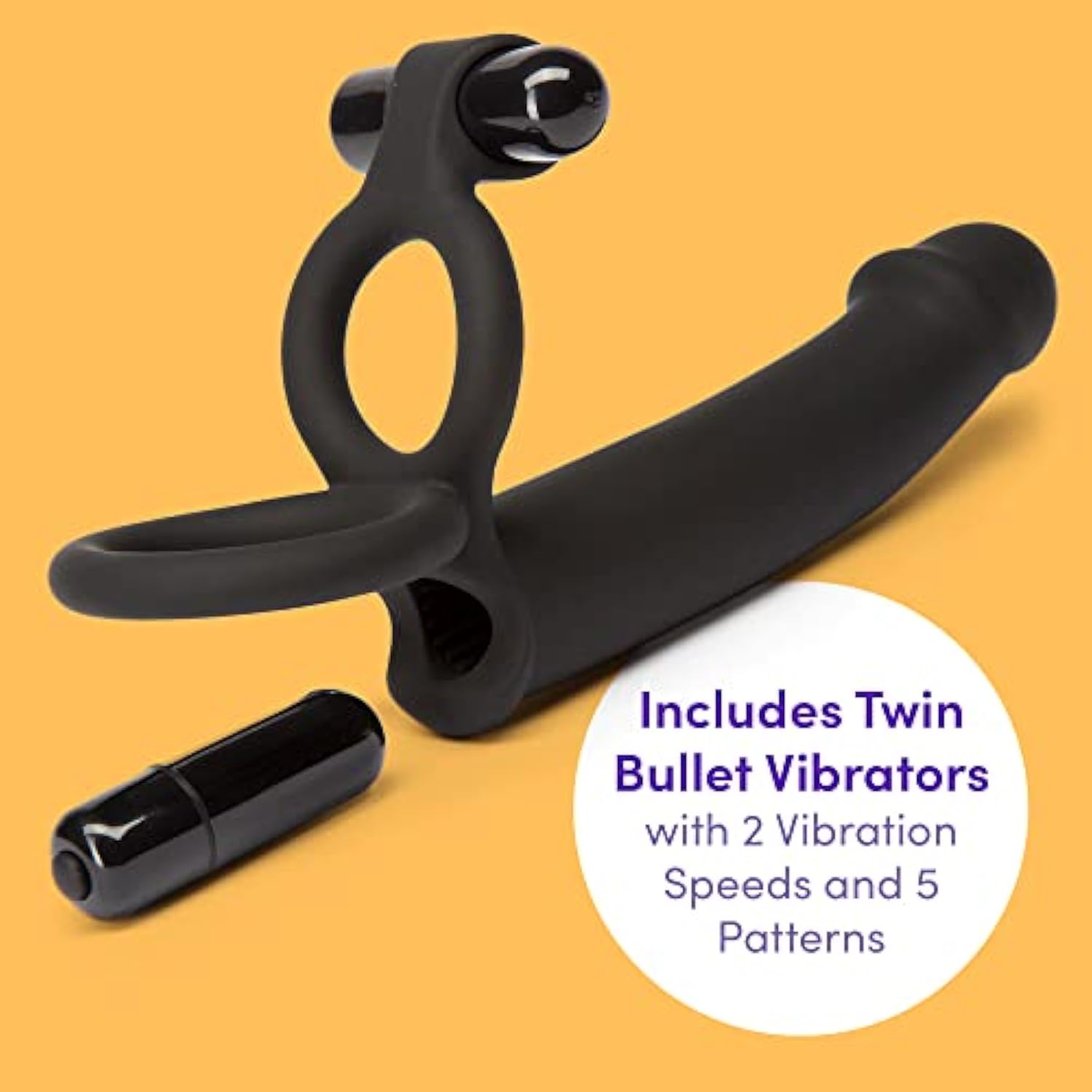 Double Fun Vibrating Double Penetration Strap On Dildo - 5.5 Inch Silicone Strap On Dildo For Men - 2 Bullet Vibrators & Cock And Ball Rings - Waterproof - Black