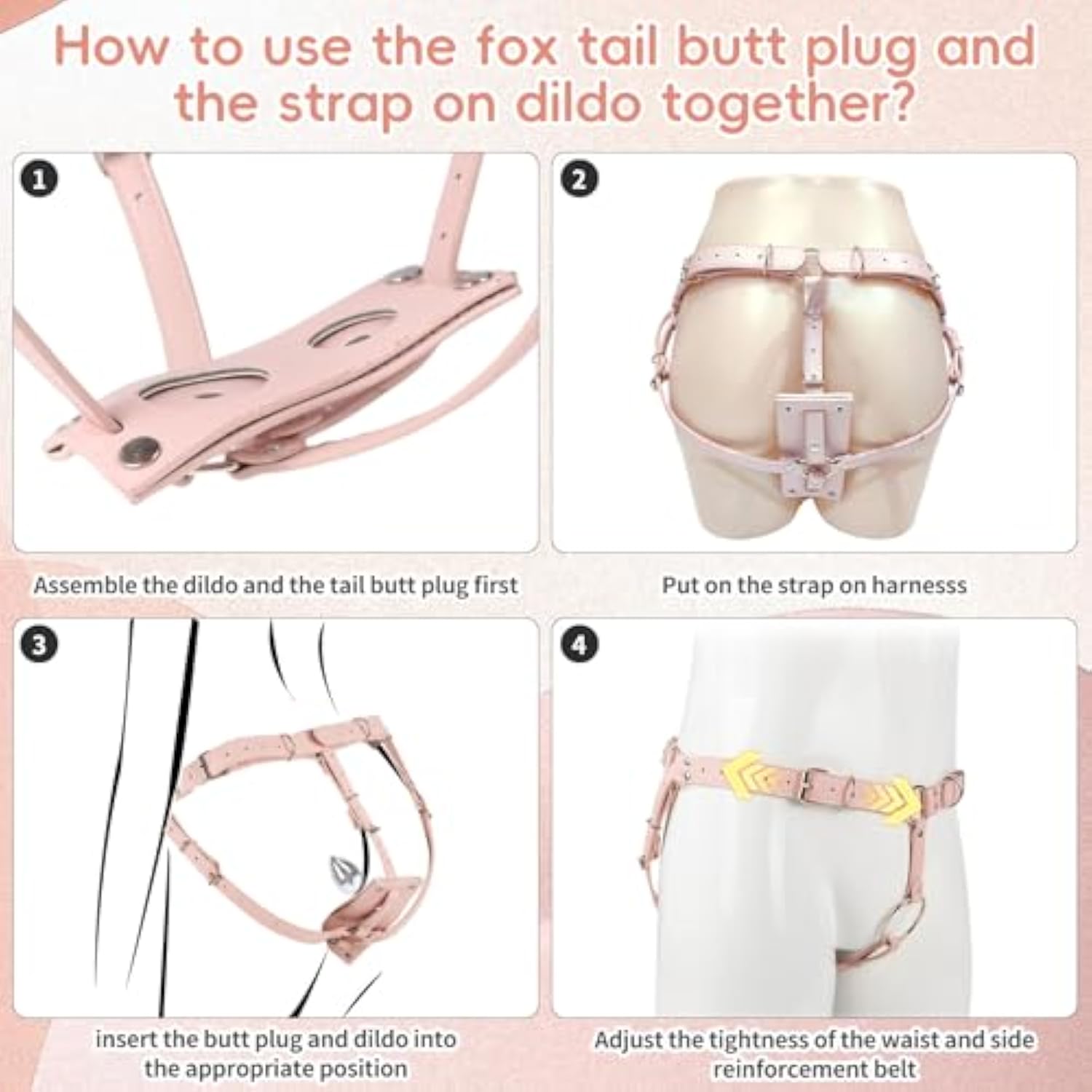 | 1. All-In-One Experience --- Get Everything You Need For Unforgettable Double Penetration Play: 1 Unisex Harness, 2 Interchangeable O-Rings, And 1 Detachable Butt Plug. Fits Waist Sizes From 24" To 43" – Perfect For Most Body Types. | | 2. Designed For Double The Pleasure --- This Harness Features A Dual-Slot Base That Holds Both A Dildo And A Plug – Enabling Vaginal And Anal Stimulation At The Same Time. Snap-On Rings Make Swaps Quick And Easy. | | 3. Fully Adjustable For Comfort --- With Straps Around The Waist And Crotch, The Harness Adjusts For A Snug And Secure Fit During Intense Movement Or Roleplay. Flexible Sizing Makes It Ideal For Couples And Solo Use. | | 4. Detachable Anal Plug With Tail Slot --- Use The Cute Plug Solo Or Combined With The Harness. The Spiral-Lock Design Ensures Firm Placement, And The Tail Slot Adds Extra Fantasy Fun For Cosplay And Roleplaying Sessions. | | 5. Soft, Durable Body-Safe --- Made From Smooth Pu Leather That’S Gentle On The Skin And Strong Enough For Wild Play. Ideal For Exploring Bdsm Fantasies Or Spicing Up Couple Play — Always With Discreet Packaging. | |