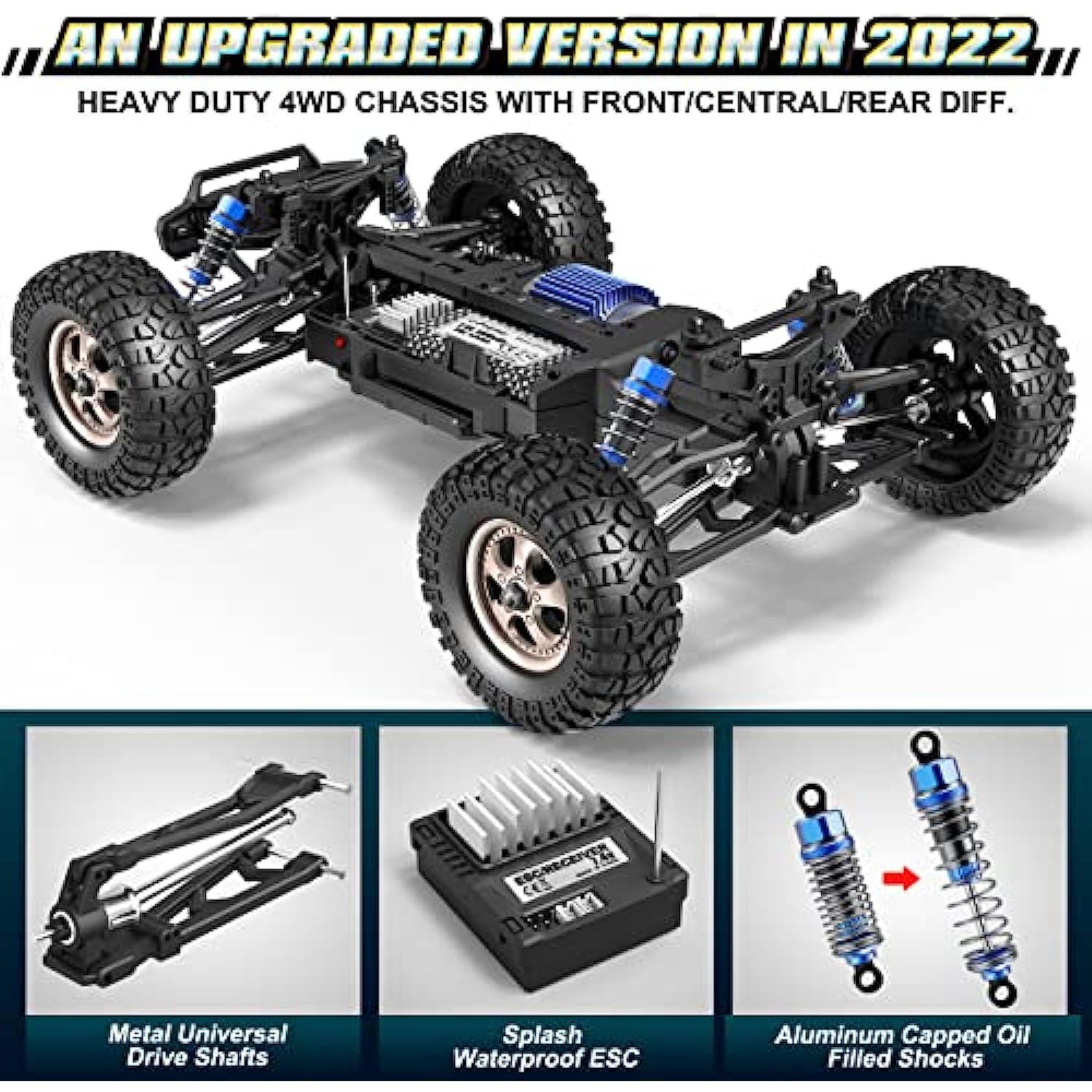 - -Equipped with the IPX4 splash waterproof electronic speed control, this 4x4 remote control car can be driven in different weather conditions. This electronic speed control embodies intelligent alerts in case of occurrences of overheat, over-current, electronic blockade, and possesses low battery voltage cutoff protection to maintain the battery packs from over-discharging circumstances.