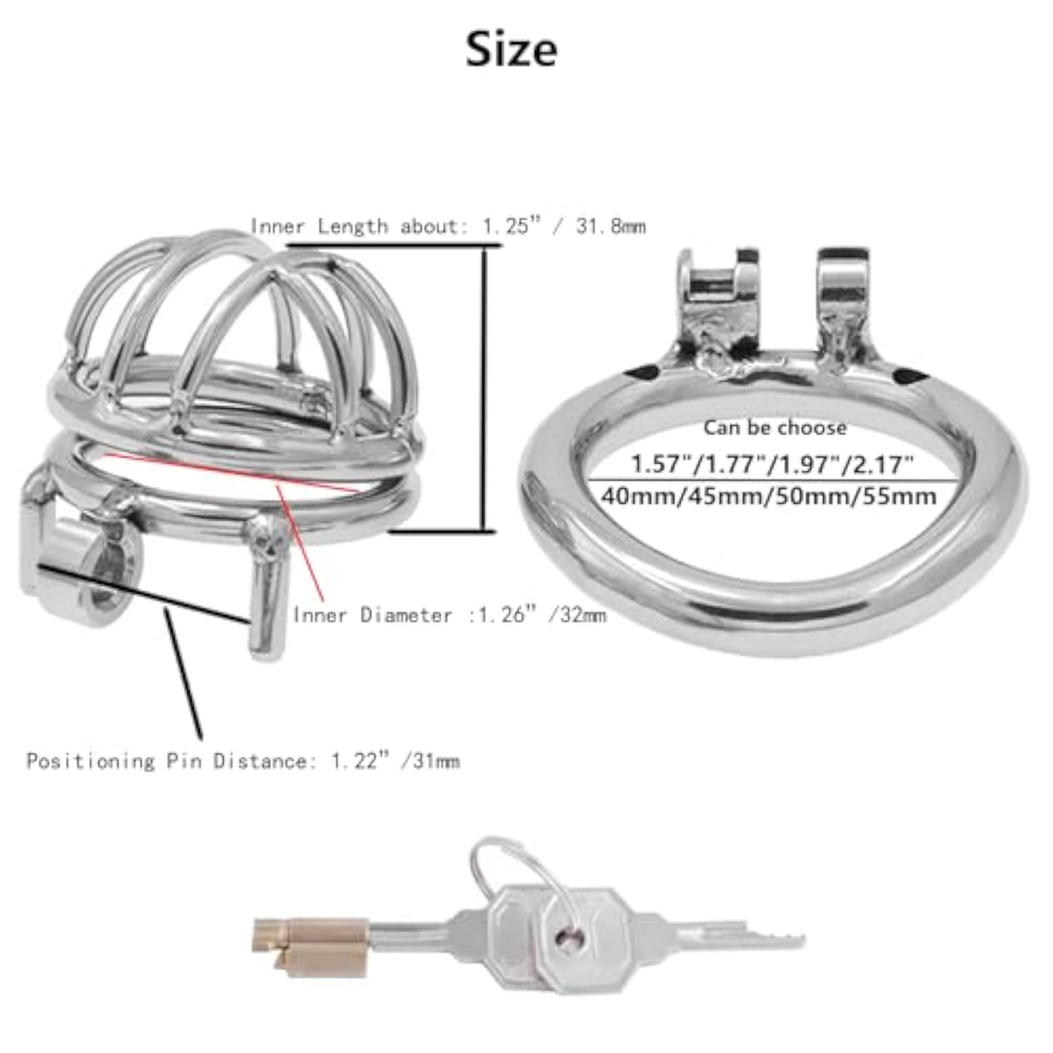 | 100% Brand New. High Quality Stainless Steel, Non-Plated, Hypoallergenic | | Hand Polished, Very Smooth Surface. | | 4 Different Ring Sizes Available (1.57''/ 1.77''/ 1.97''/ 2.17'') Choose The Suitable Inner Diameter. | | Discreet Packaging: Opaque Packaging That Hides Markings And Details Of The Contents | | The Package Only Includes A Set Of Cock Cage: 1 Separate Cage + 1 Base Ring + 1 Brass Lock + 2 Keys. | |