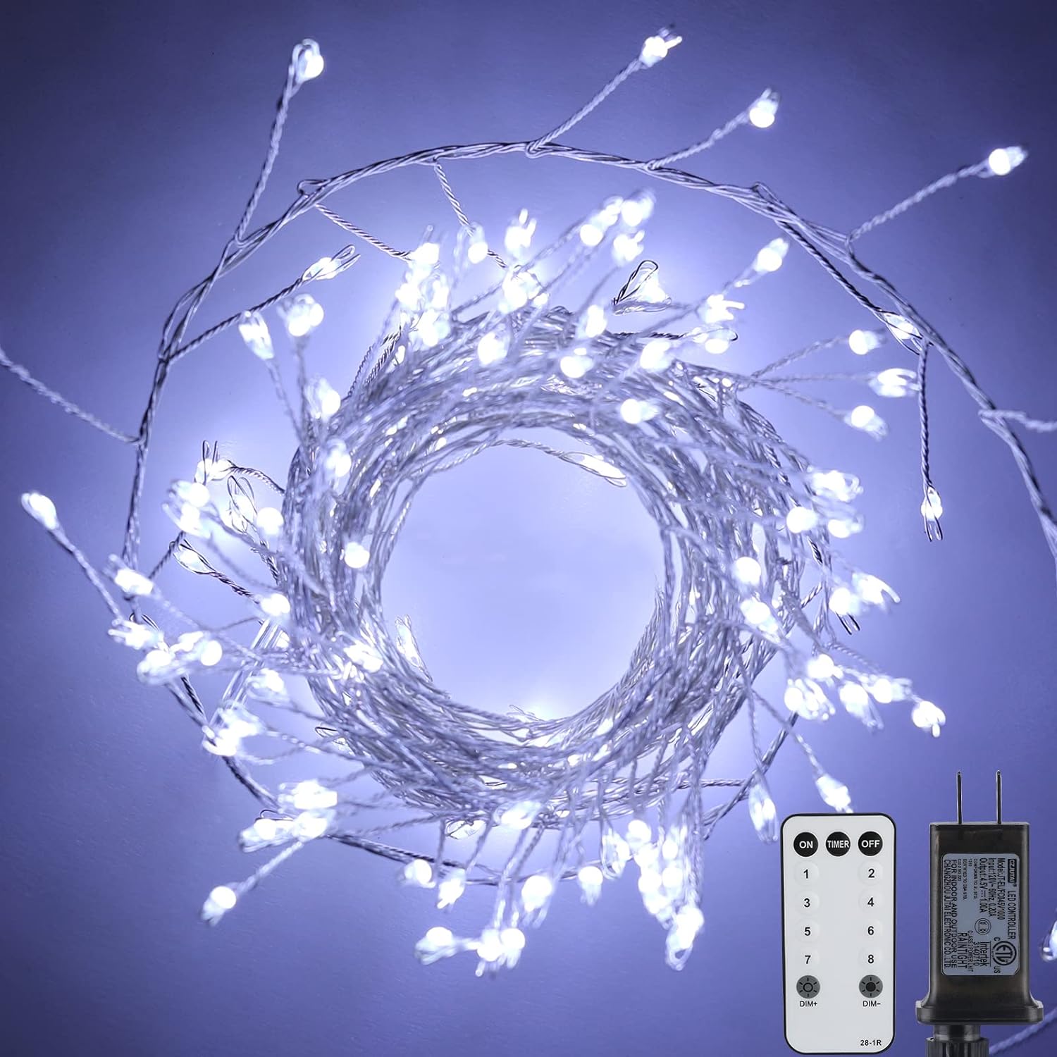 Fairy Lights Plug In, 10Feet 200 Leds Firecracker String Lights With Remote, Christmas Lights Cluster Starry String Lights For Ceiling Bedroom Wreath Garland Window Christmas Decoration, Pure White