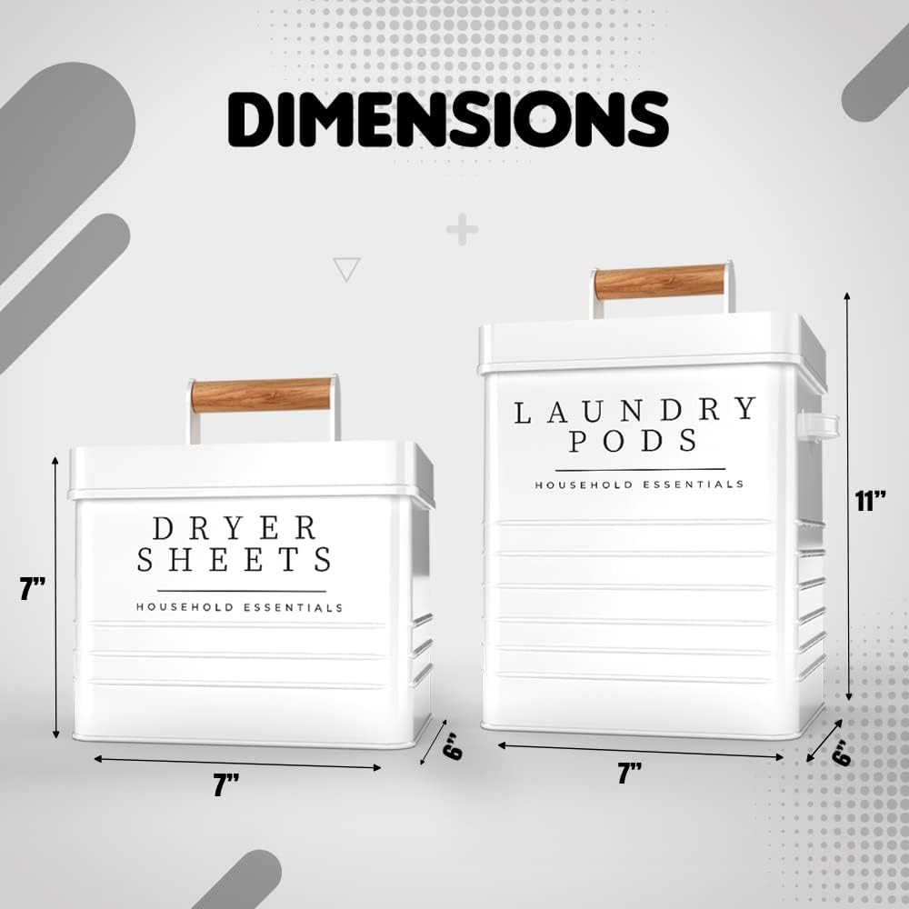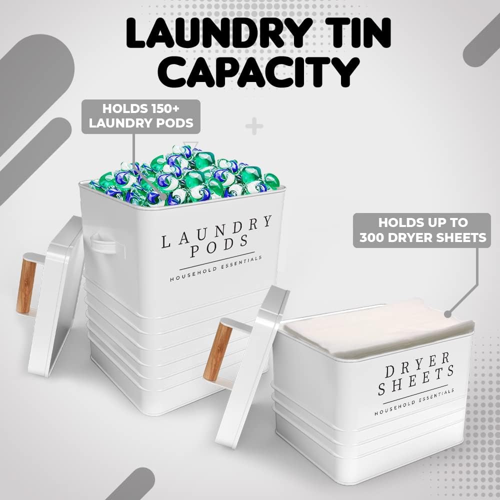 - High Quality and Durability: Our laundry pods and dryer sheets containers set is made to last. The simple design for opening and closing the containers makes it quick and easy to use. The wooden handle and airtight metal lid ensures that both your laundry pods and dryer sheets are sealed tightly and protected from any outside exposure.