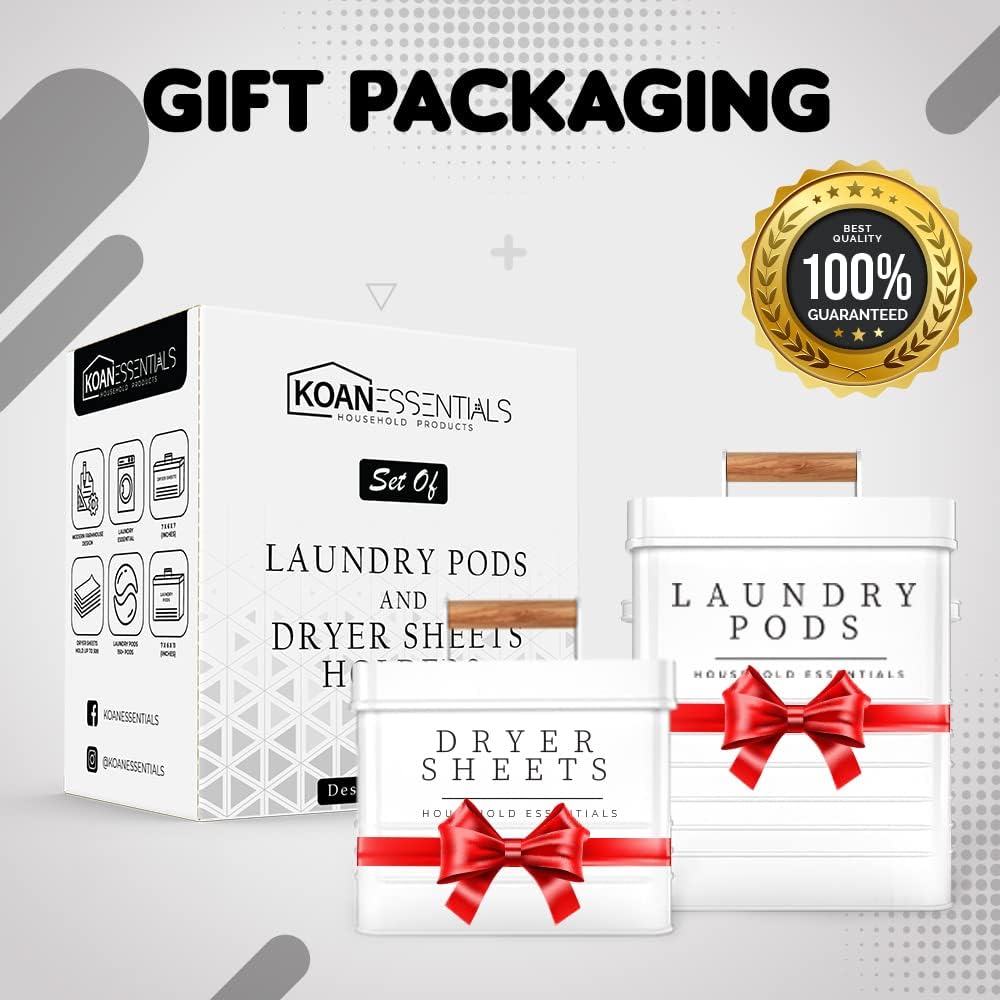 - KOANEssentials Modern Farmhouse Decor Laundry Pods and Dryer Sheets Containers Set: Take organizing to the next level with our laundry pods and dryer sheets containers set which holds over 150 laundry pods and 300 dryer sheets. Our laundry organizing set can be used for more than one purpose. The containers can hold dryer balls, lint, laundry scent boosters, laundry detergent powder (not intended for liquid laundry detergent) and more making these containers multi-purpose.
