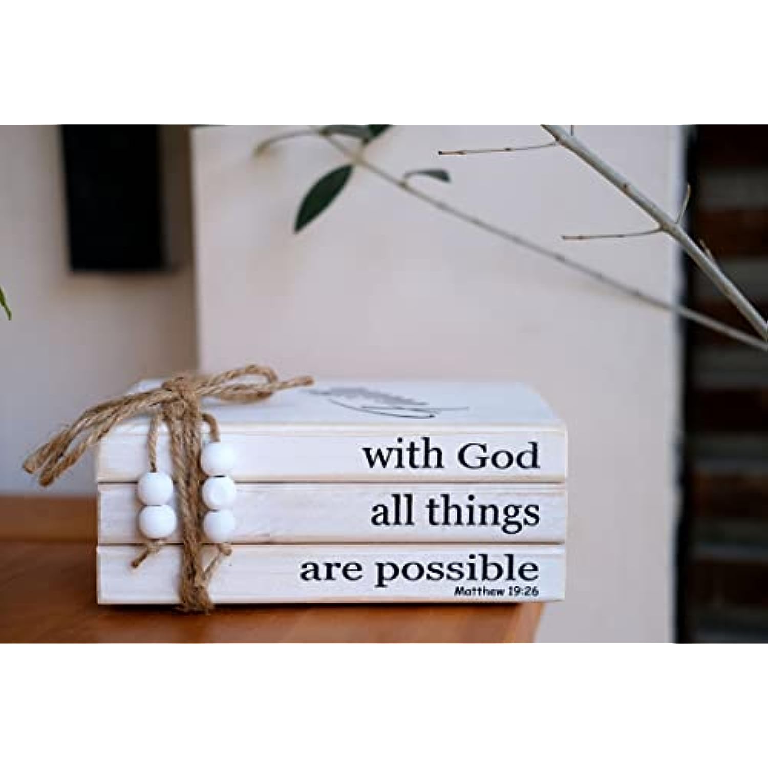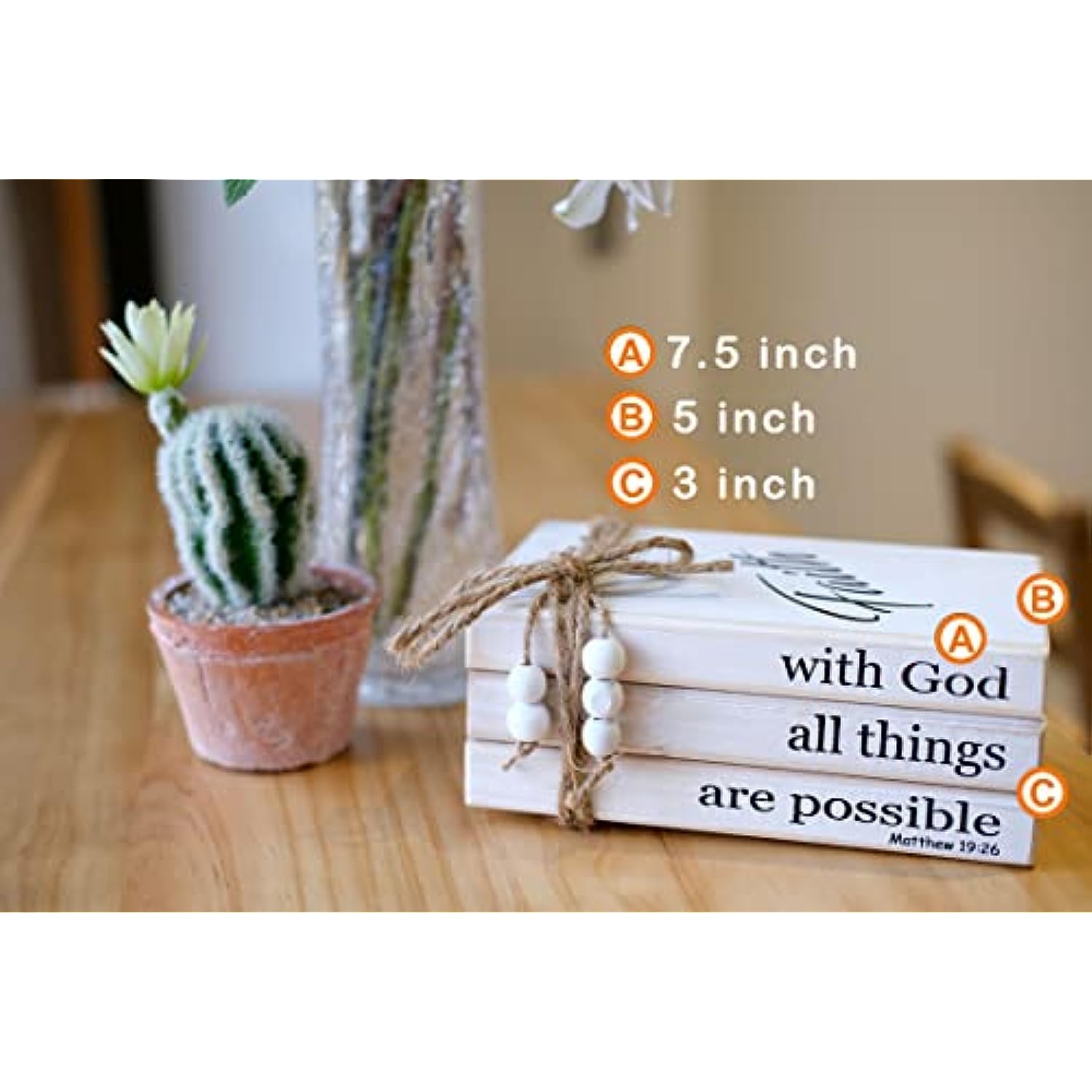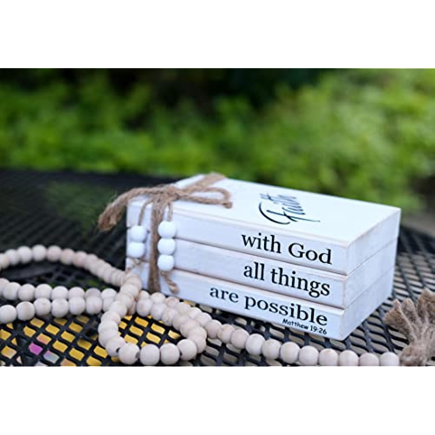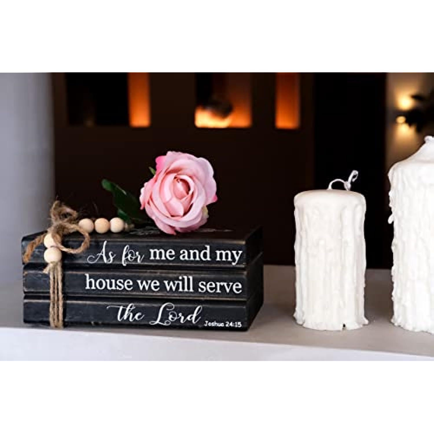- HANDCRAFTED WOOD BOOK STACK: This farmhouse stacked books decor consists of 3 books made of solid cedarwood. White painted with rustic distressing finish. Large "Cross" printed on top book face, while books' spine has quote from Bible "As for me and my house we will serve the Lord". 3 farmhouse wood books glued together, won't move to get loose, bookstack bound with rustic twine,the hemp rope's ends are threaded with white wood beads.