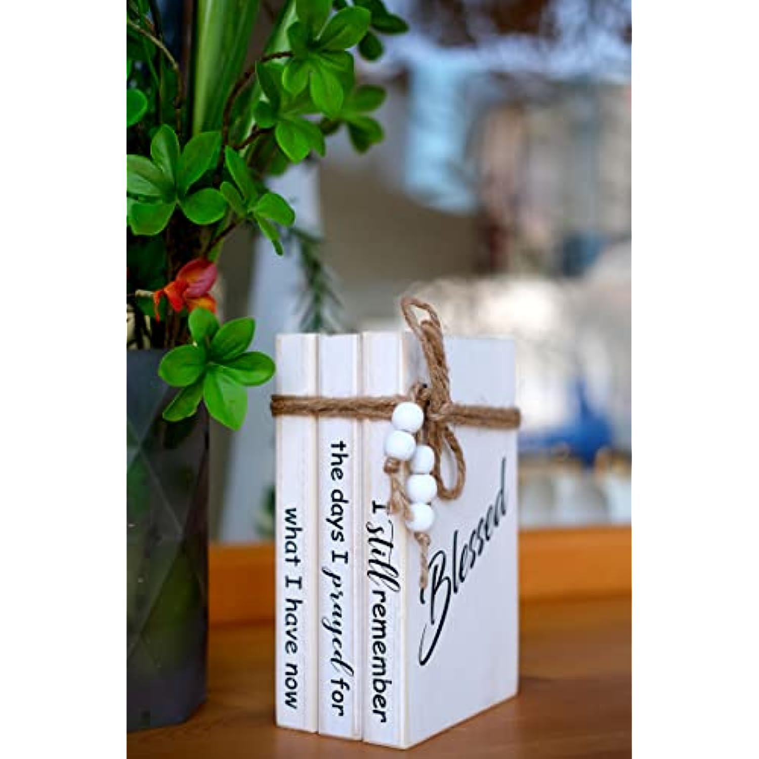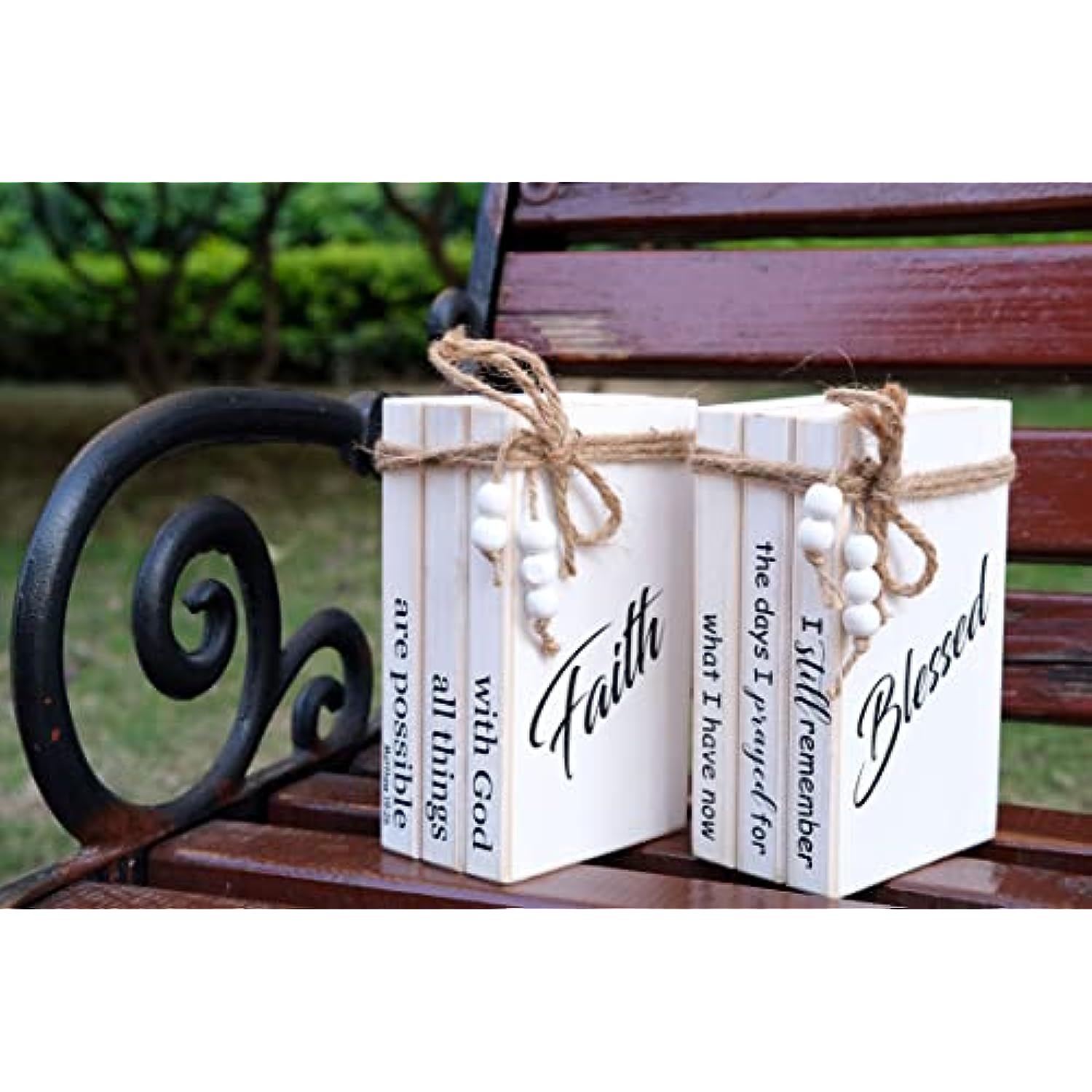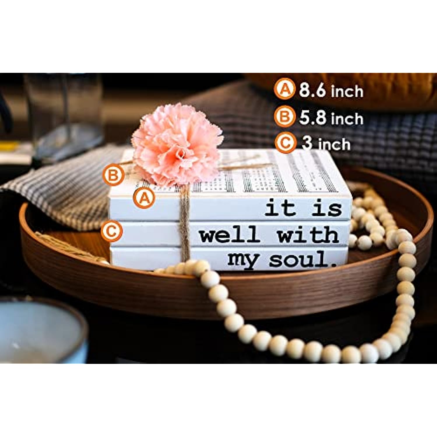 - HANDCRAFTED WOOD BOOK STACK: This farmhouse stacked books decor consists of 3 books made of solid cedarwood. White painted with rustic distressing finish. Large "Cross" printed on top book face, while books' spine has quote from Bible "As for me and my house we will serve the Lord". 3 farmhouse wood books glued together, won't move to get loose, bookstack bound with rustic twine,the hemp rope's ends are threaded with white wood beads.