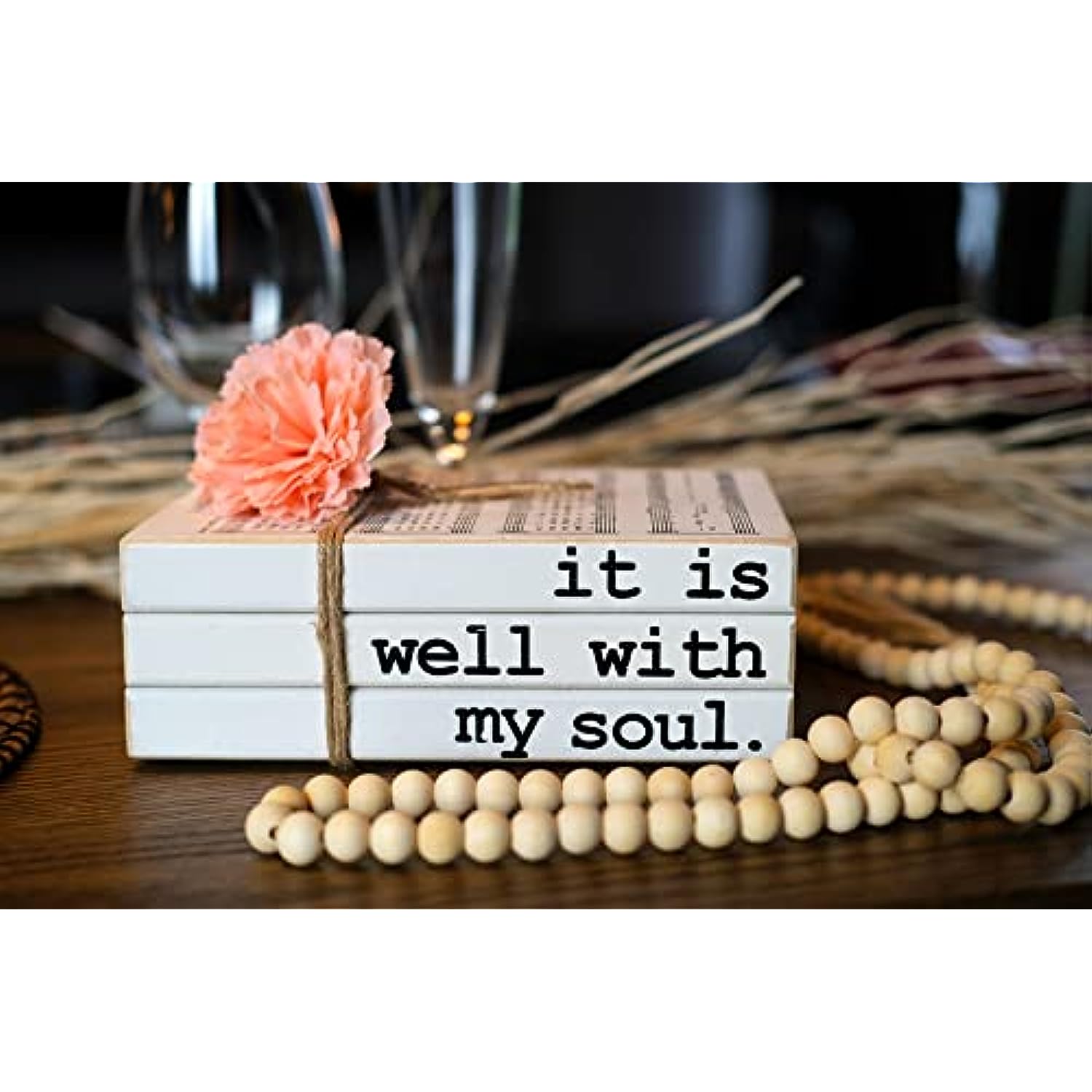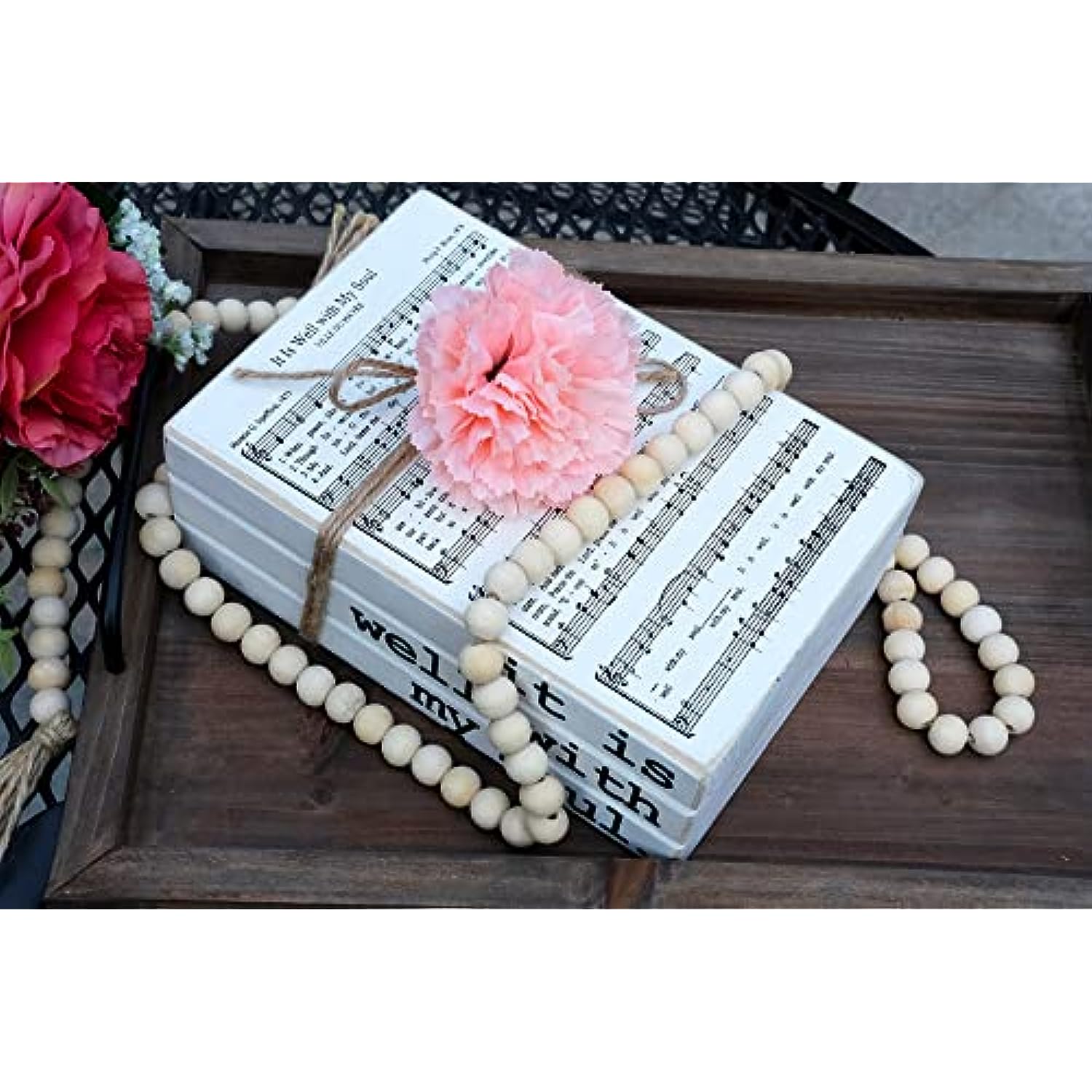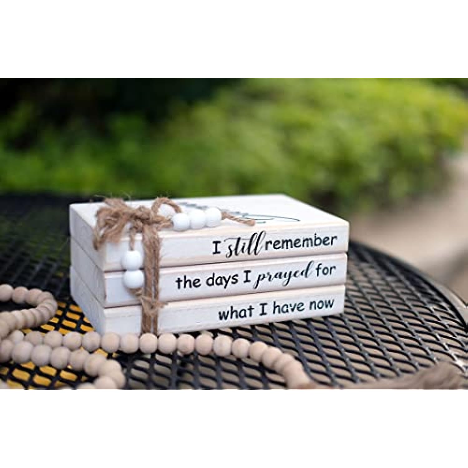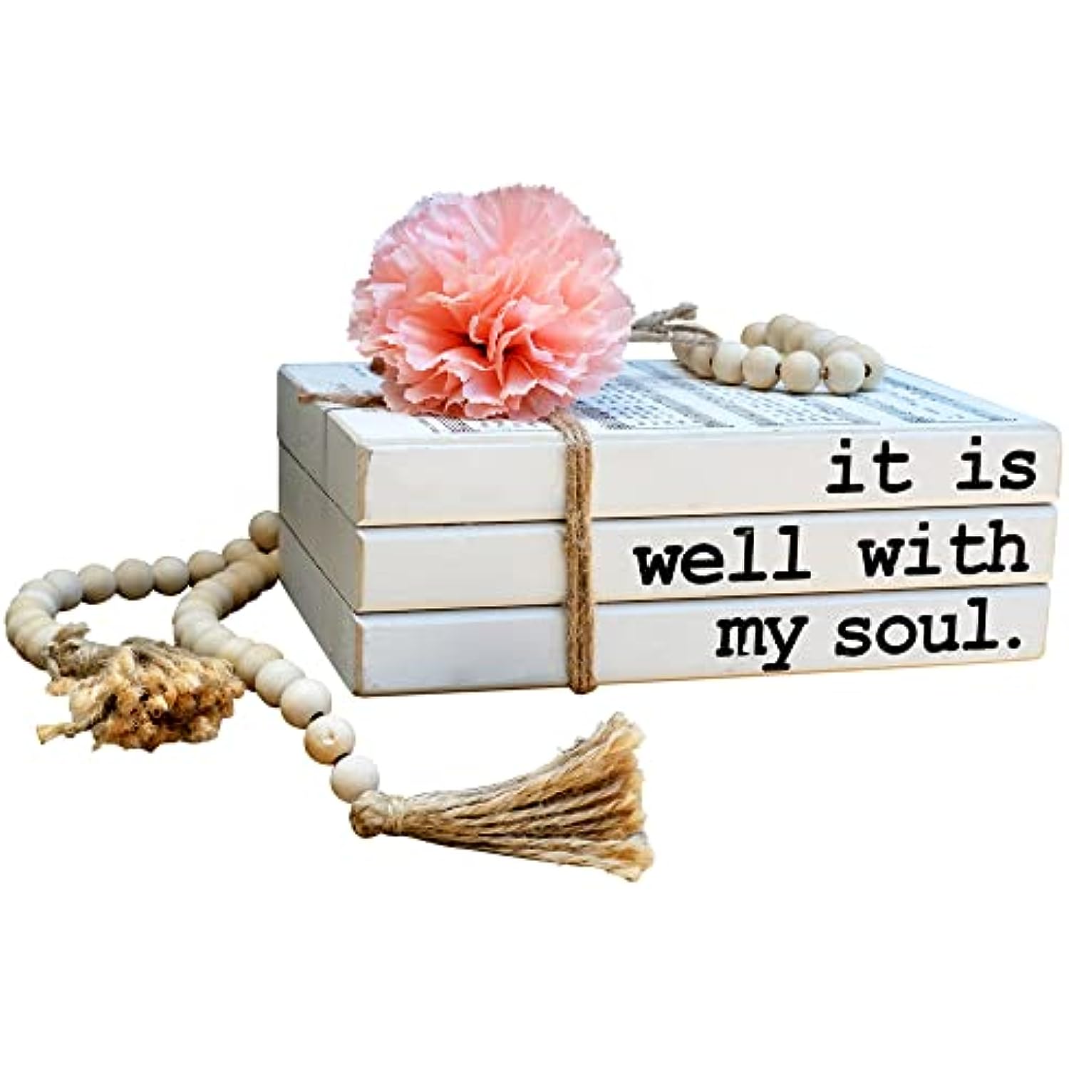- HANDCRAFTED WOOD BOOK STACK: This farmhouse stacked books decor consists of 3 books made of solid cedarwood. White painted with rustic distressing finish. Large "Cross" printed on top book face, while books' spine has quote from Bible "As for me and my house we will serve the Lord". 3 farmhouse wood books glued together, won't move to get loose, bookstack bound with rustic twine,the hemp rope's ends are threaded with white wood beads.