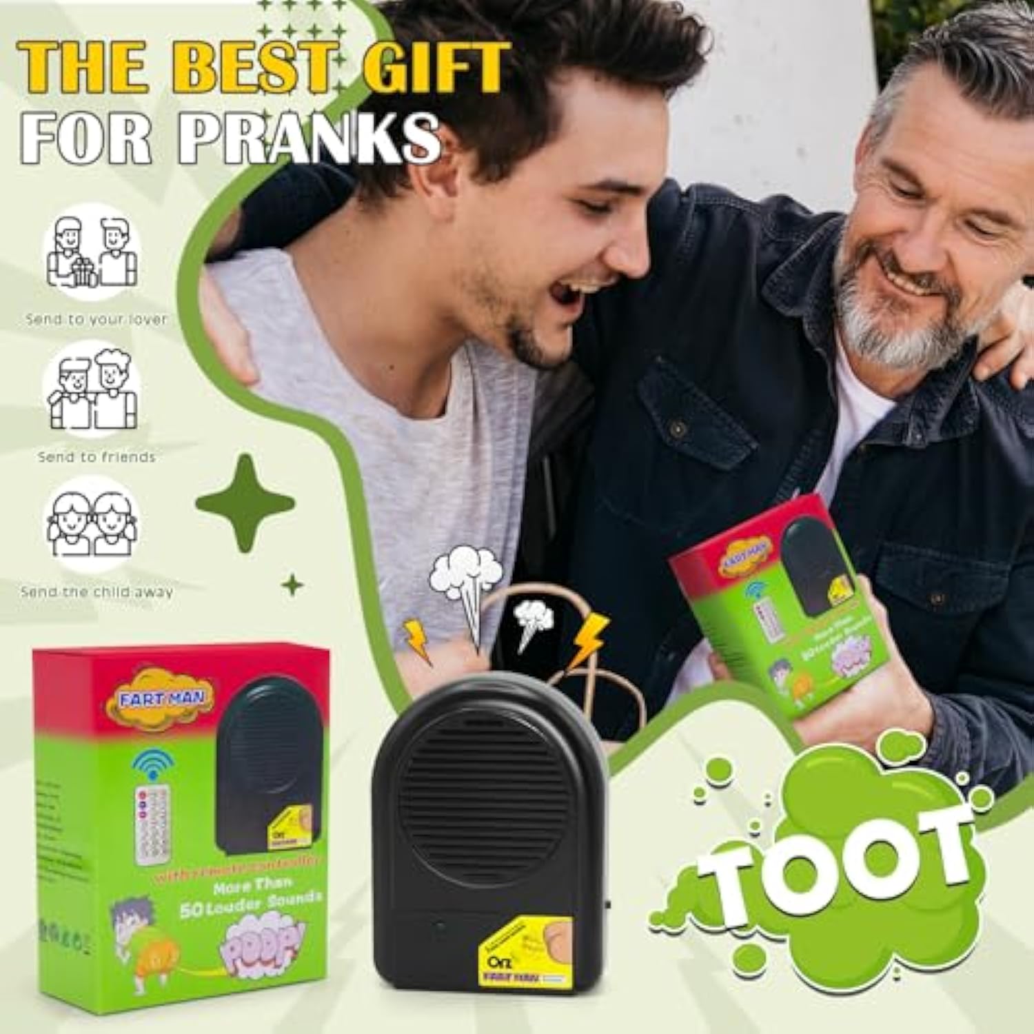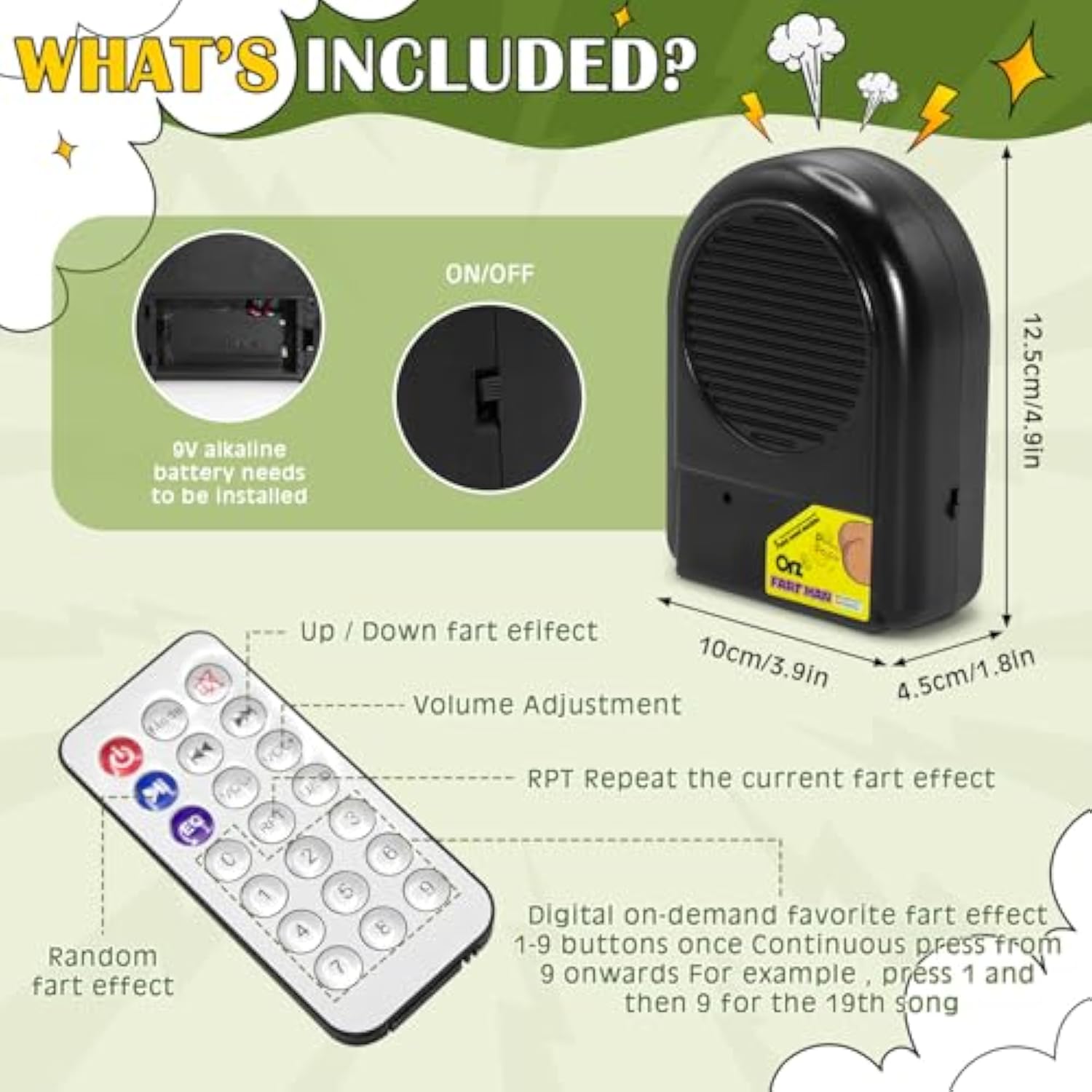 | ?50 Hilarious And Realistic Sounds?Packed With 50 Unique Fart Sounds—From Quick Bursts To Long Rumbles—For Endless Laughs. Choose Your Favorite Or Play Them All In Sequence For Maximum Surprise. | | ?Includes Remote Control – 10M Wireless Range?This Fart Machine Comes With A Handy Remote, Letting You Trigger Sounds From Up To 10 Meters Away. Perfect For Pranks From The Next Room, Under The Couch, Or Across The Office. | | ?Manual Auto Play Options?Select Individual Sounds Manually Or Let The Machine Cycle Through All 50 In Order. With The Remote, You’Re Always In Control Of The Chaos. | | ?Adjustable Volume Settings?Turn The Volume Up For Attention-Grabbing Gags Or Keep It Low For Subtle Sneak Attacks. Customize The Sound Level To Fit Your Prank Style. | | ?Battery Powered – Easy To Use?Powered By A Standard 9V Battery (Not Included). Just Insert The Battery, Grab The Remote, And Get Ready For Nonstop Fun—No Charging Or Setup Required. | |