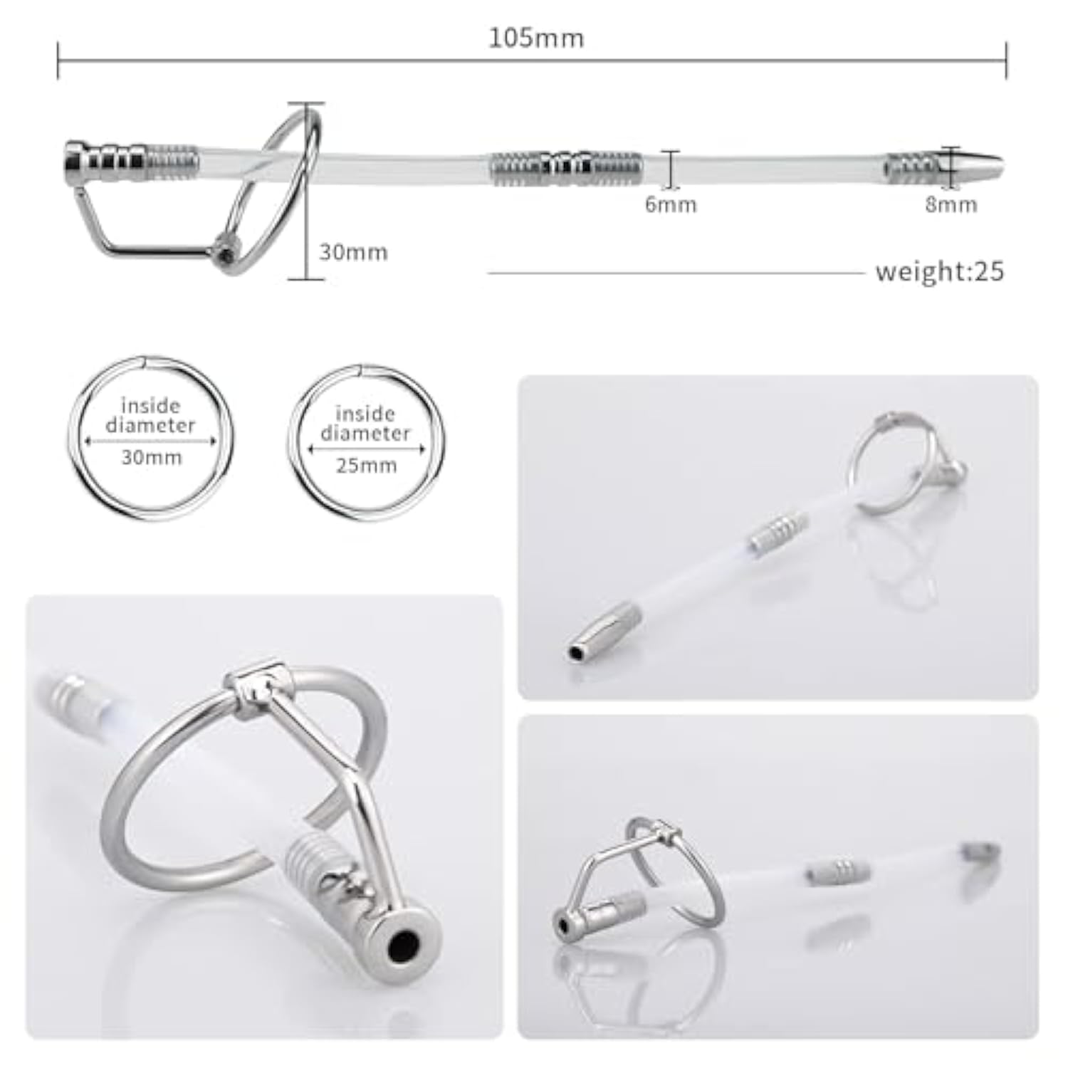 | ?Size?The Dilator Is Approximately 200Mm Long In Total, Features Hollow Probe Shaft In 9Mm Dia, Stainless Steel Bead Tip On Plug End. The Silicone Tube Is Cut-Table, You Can Adjust The Length As You Desire. | | ?Material?Medical Grade Stainless Steel Tip And Handle, Smooth And Durable, Rust-Proof, No Allergic Reaction. The Entire Urethral Plug Works With Any Water-Based Lubricants. | | ?Silicone Hollow Tube?Soft And Flexible Silicone Hollow Tube Allows Urination And Ejaculation, Provides Comfortable Contour With Urethral Muscles. And With Its Screw-In Tube Cover, You Or Your Partner Can Decide When To Restrain Or Release. | | ?Penis Rings?2 Penis Ring Of Diameter 25Mm 30Mm. Glans Ring On Top Which Helps You Gaining A Firmer Erection And Delaying Your Ejaculation To Make Sure Your Full Climax Fun. It Also Effectively Preventing The Plug From Going In Too Deep. | | ?Discreet Package? Note: This Item Fits For Most Men, But Please Check The Sizing Information On Our Photos Before Purchase. Please Sanitize With Alcohol Before And After Use. | |