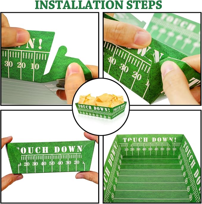 - Food Grade & Non-toxic Material: these football party paper food tray are made of thick cardboard, double sided printed and laminated, waterproof and oil-resistant, so you can enjoy your snacks without worrying about spills or oil stains;