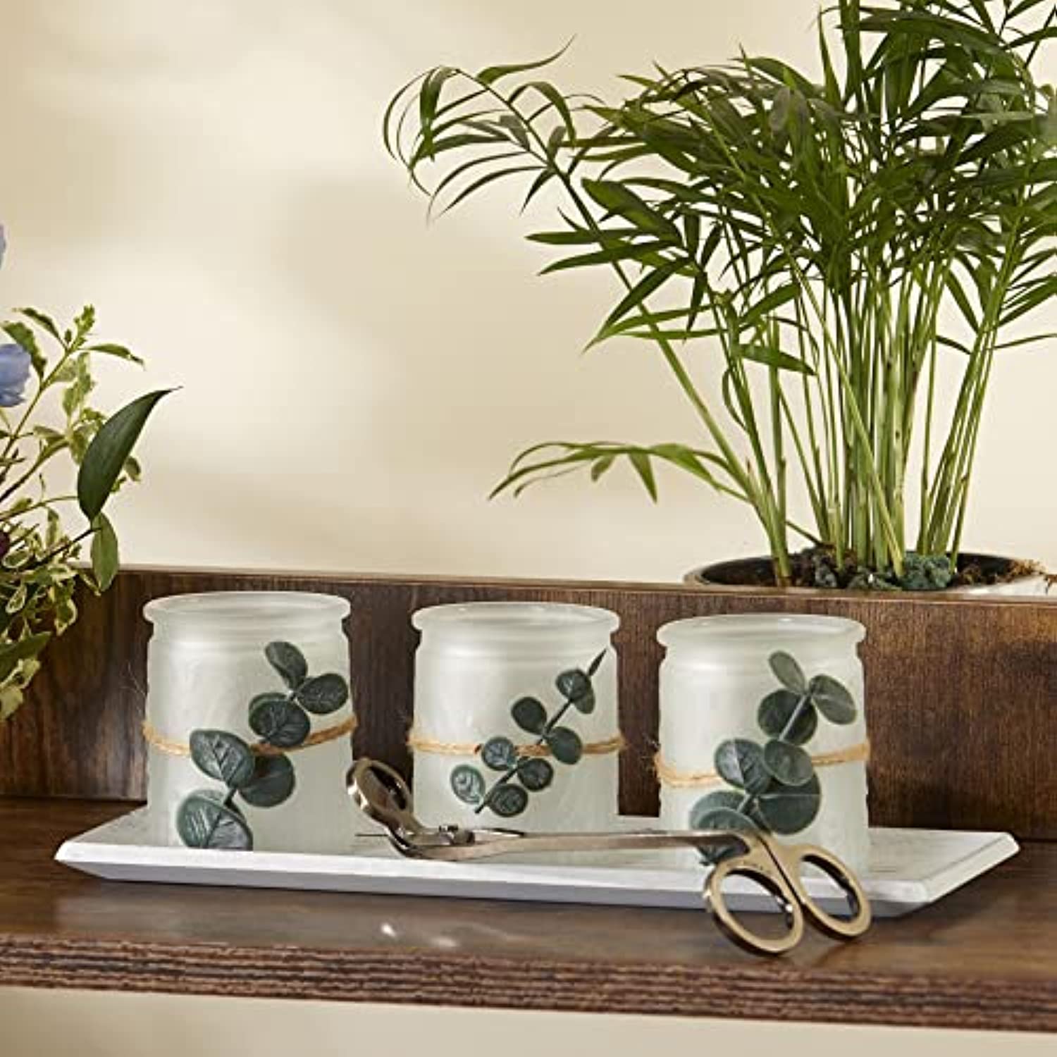 - MODERN MEETS RUSTIC - The Farmhouse Decor Eucalyptus 4 Piece Frosted Votive Candle Holder & Tray Set includes 1 modern rustic tray, three frosted votives and a sprig of eucalyptus tied to each votive. Each votive and the tray are wrapped in bubble wrap and shipped in a kraft box.