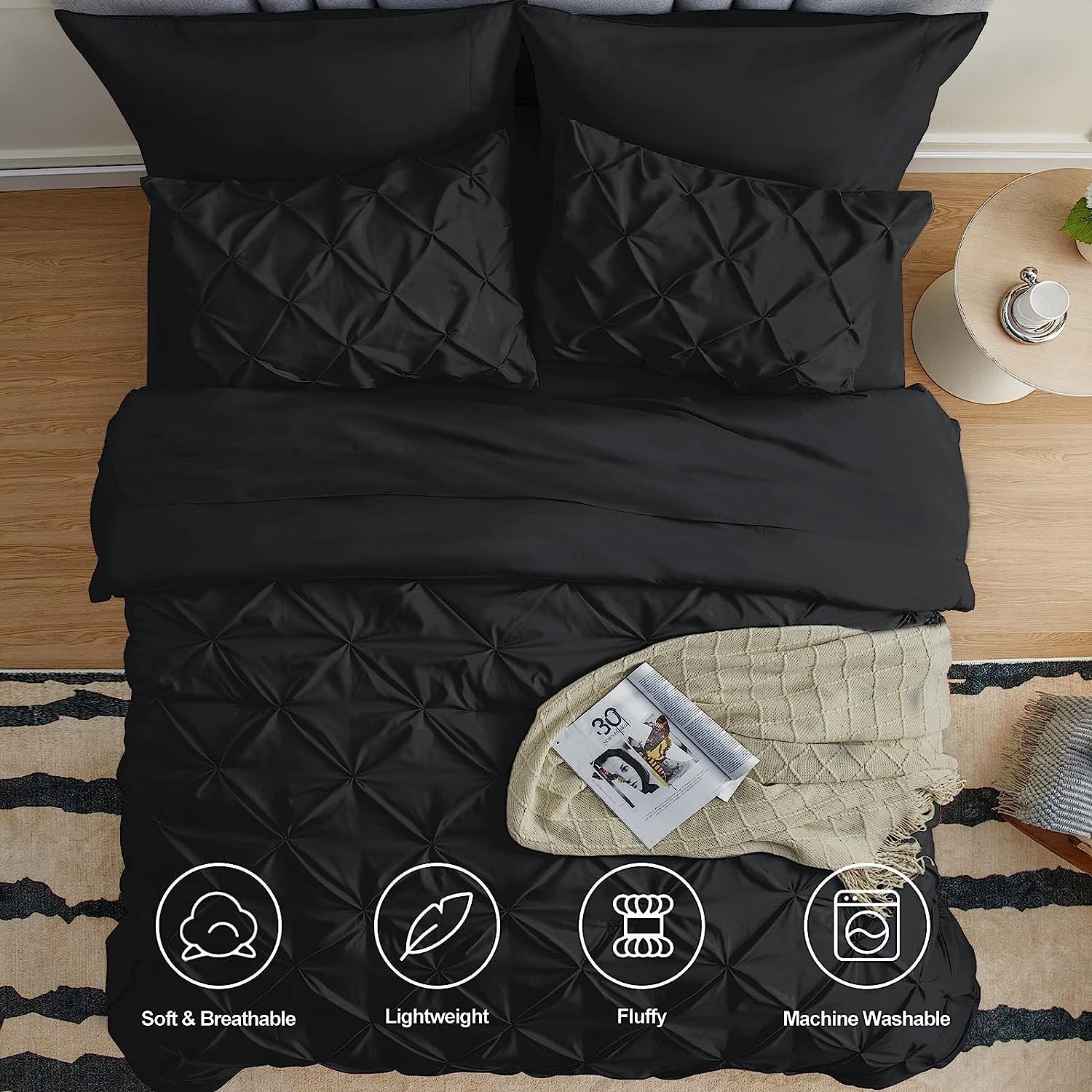 Full Comforter Set - 7 Pieces Comforters Full Size Black, Pintuck Bed In A Bag Pinch Pleat Bedding Sets With All Season Comforter, Flat Sheet, Fitted Sheet And Pillowcases & Shams
