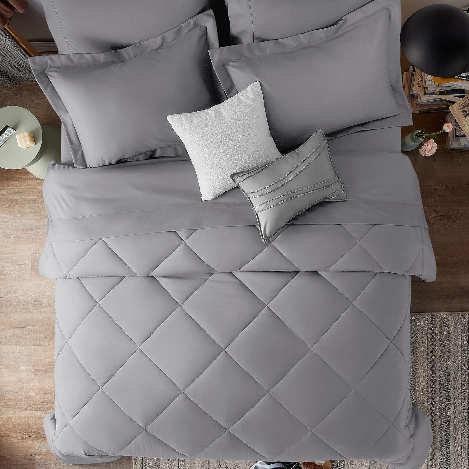 Full Comforter Set With Sheets 7 Pieces Bed In A Bag Light Grey All Season Bedding Sets With Comforter, Pillow Shams, Flat Sheet, Fitted Sheet And Pillowcases