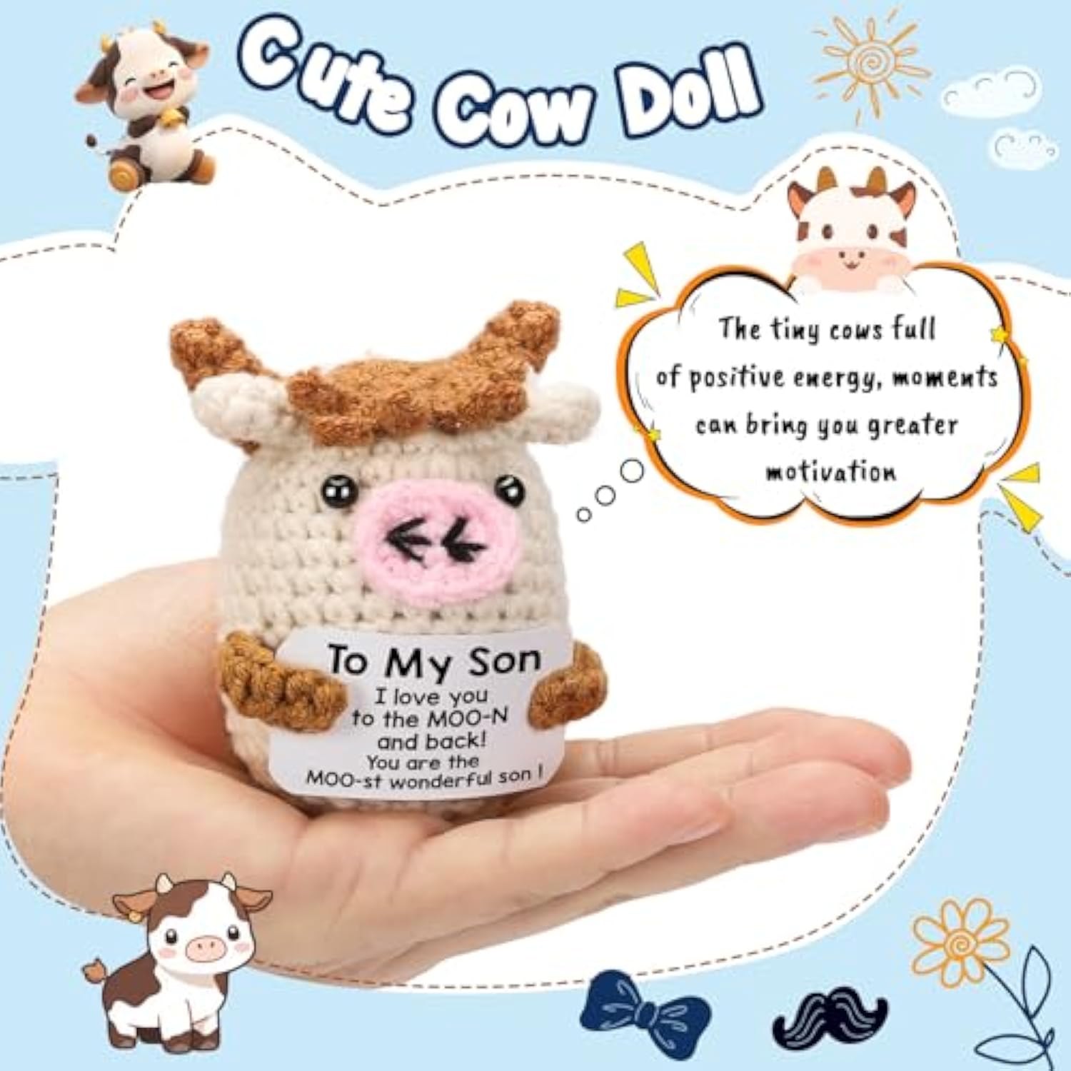 | Son Gifts For Christmas/Birthday: This Handmade Knitted Cow Doll With Its Playful Message, “Son I Love You To The Moo-N And Back! You Are The Moo-St Wonderful Son!” Is More Than Just A Cute Cow Doll, Is The Perfect Way To Express Love And Affection To Son Special | | Gifts For Son From Mom/Dad: In Today’S Fast-Paced World. Whether Son At Study, Work, Home, Or On The Go, This Cute Cow Doll Is Perfect For Melting Away Stress And Helping Him Unwind, It Can Be Son Cute Companion, Always Remind Him Is Moo-St Wonderful Son | | Christmas Gifts For Son: If Want To Surprise Son With Love, This Mini Funny Positive Potato Cow Is The Perfect Choice. Use It To Decorate Son Life, Such As Desks, Shelves, Or Bedside Tables Decor, Son Will Gain The Vibe And Pow | | Ideal Son Christmas Gifts: Let This Thoughtful And Unique Gifts Reminds Son Just How Much He’S Loved, You Can Make It As Ideal Birthday Graduation Gifts Thanksgiving Gifts Christmas Gifts White Elephant Gifts Fathers Day Gifts For Son - Make Son Lives More Good Humour | | Handmade Crochet Cow Presents For Son: This Crochet Cow Is Made With High-Quality Yarn, Meticulously Hand-Stitched For An Appealing Look, With A Soft And Comfortable Touch Is Not Only Cute But Also Incredibly Soft The Size Is Approximately 3.5 X 2.36 Inches | |