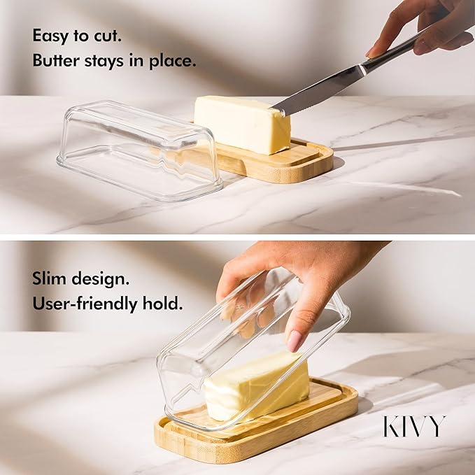 - EASY TO CLEAN - The borosilicate glass lid is dishwasher safe and the bamboo plate of the butter stick holder is easy to wash with a damp cloth. Measurements of the KIVY glass butter dish with lid for countertop: L 7.2 | W 3.5 | H 2.5 in.