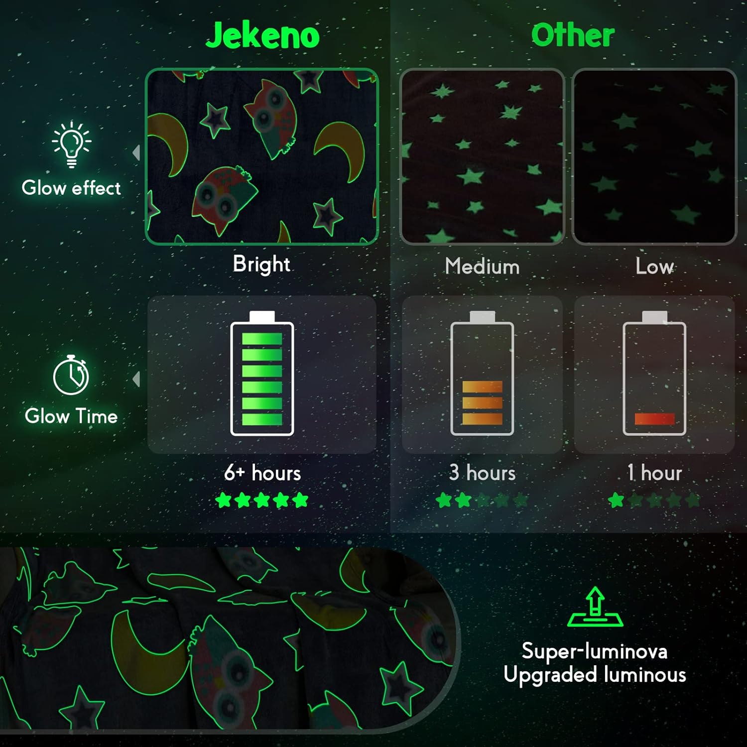 - Upgraded Luminous: Gow In The Dark Blanket Is Made Of Great Quality Luminous Fiber Woven Material To Absorb And Store Light Energy, Long-Lasting Glow In The Dark, Mysterious And Interesting.