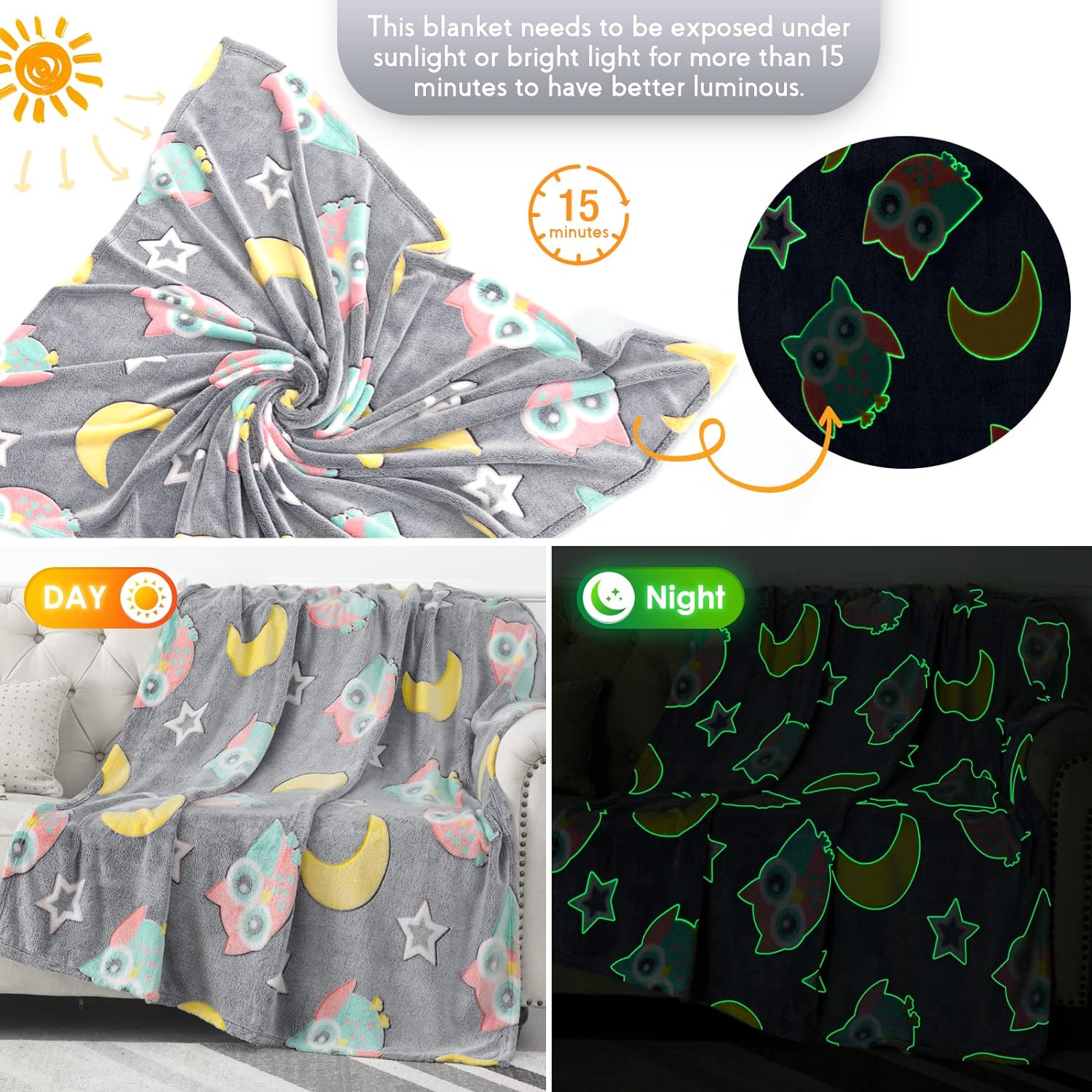 - How To Make It Glow: This Blankets Need To Be Exposed Under Sunlight Or Bright Light For More Than 15 Minutes To Have Better Luminous. The Brighter The Light Is, The Stronger The Blanket Will Glow In The Dark.
