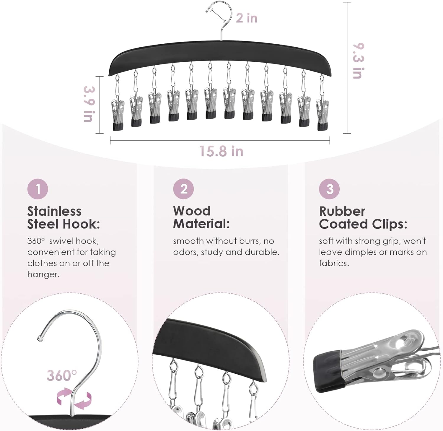 Hangers for Closet, MEILIDY 2 Pcs Wooden Hanging Leggings Organizer Hanger with Multi Clips Space Saving Scarf Organizer Storage Leggings Holder with 360° Swivel Hook - Black