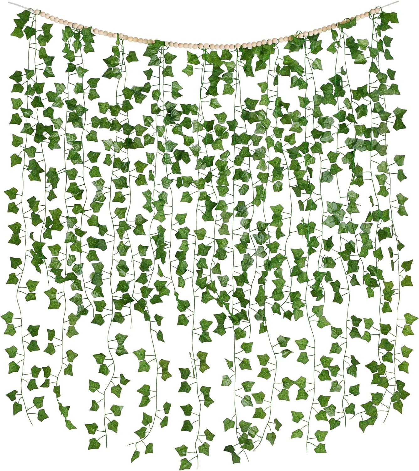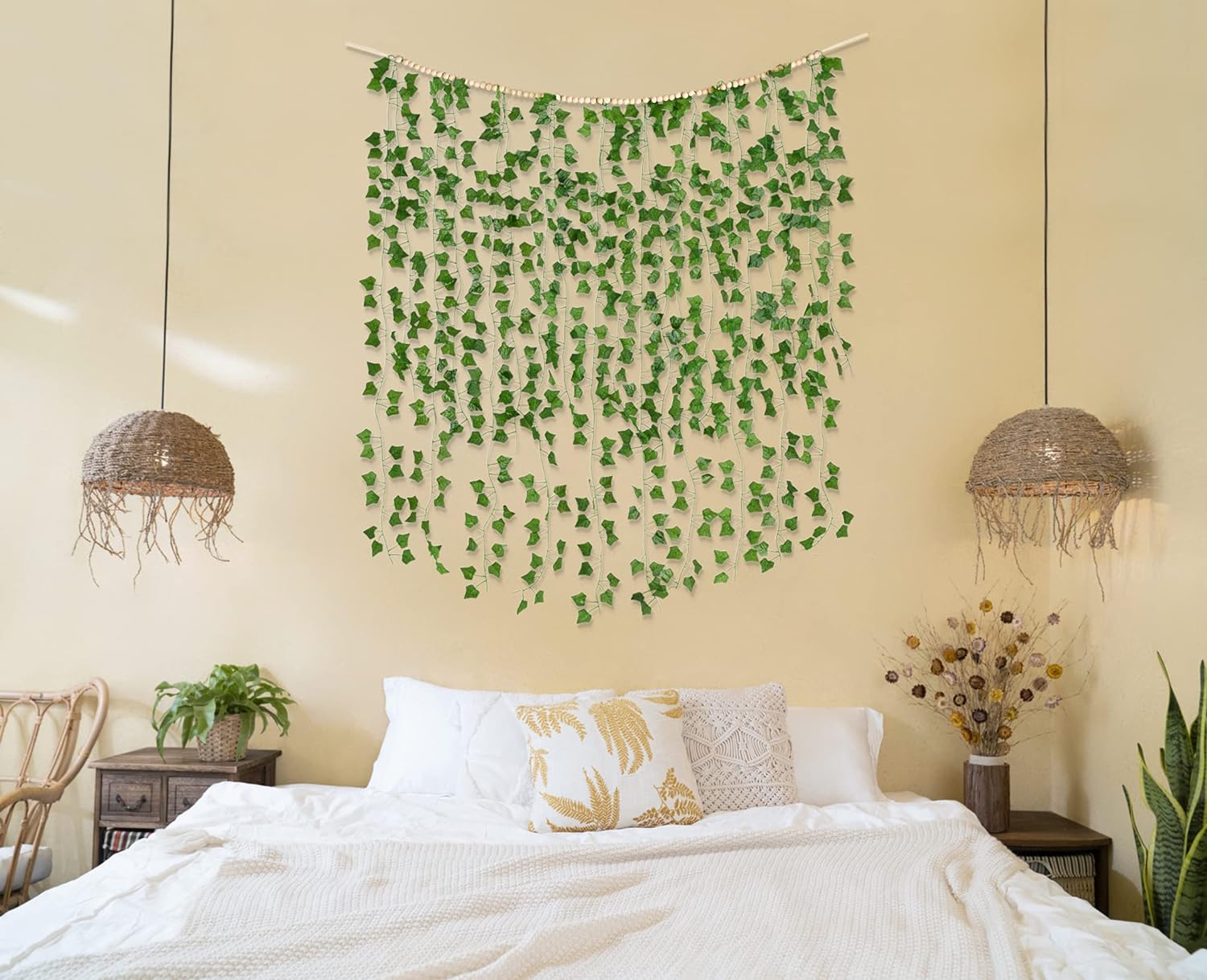 Hanging Fake Vines for Bedroom Wall Decor Artificial Plant Leaves with Wood Beads Set Indoor Greenery Ivy Garland for Living Room Apartment Wedding Party Teen Girl Room