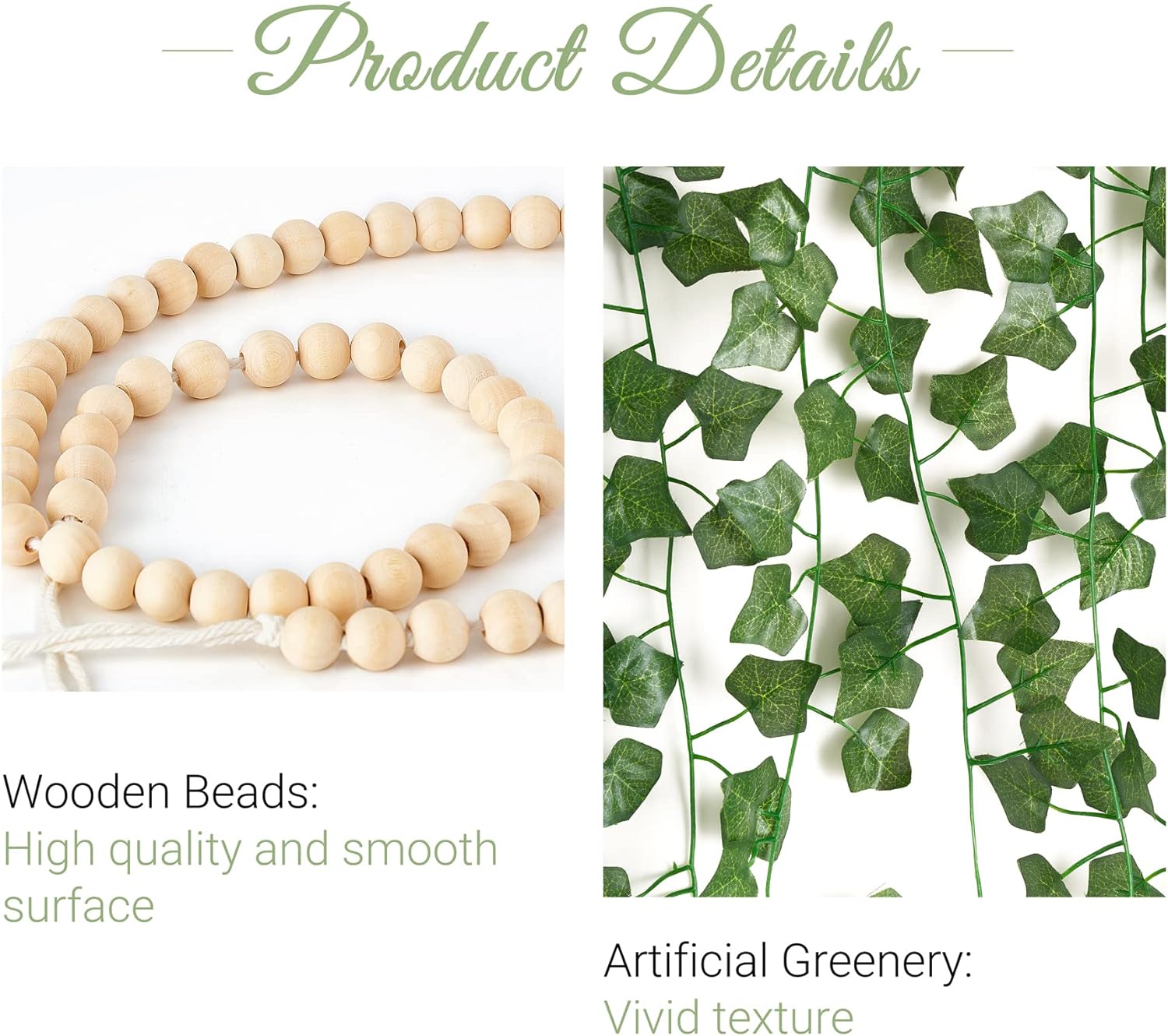 - Size and Material: Item width side to side: 53.5"W. The size of wood beads chain: 39.4"W. Height from top to the longest bottom: 47.2"H. The artificial ivy leaves are made of silk cloth and the stems of plastic. The beads are made of high-quality wood. This boho wall-hanging adds a warm and stylish ambiance to your living room, bedroom, nursery, and other interior spaces.