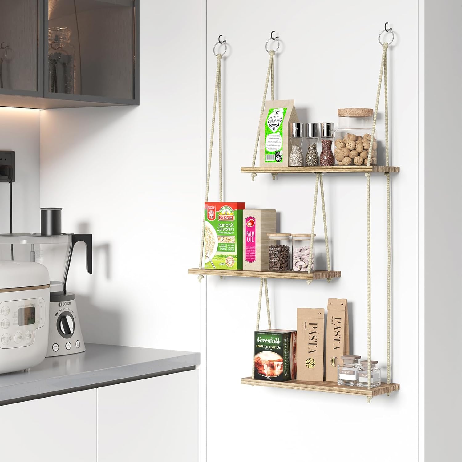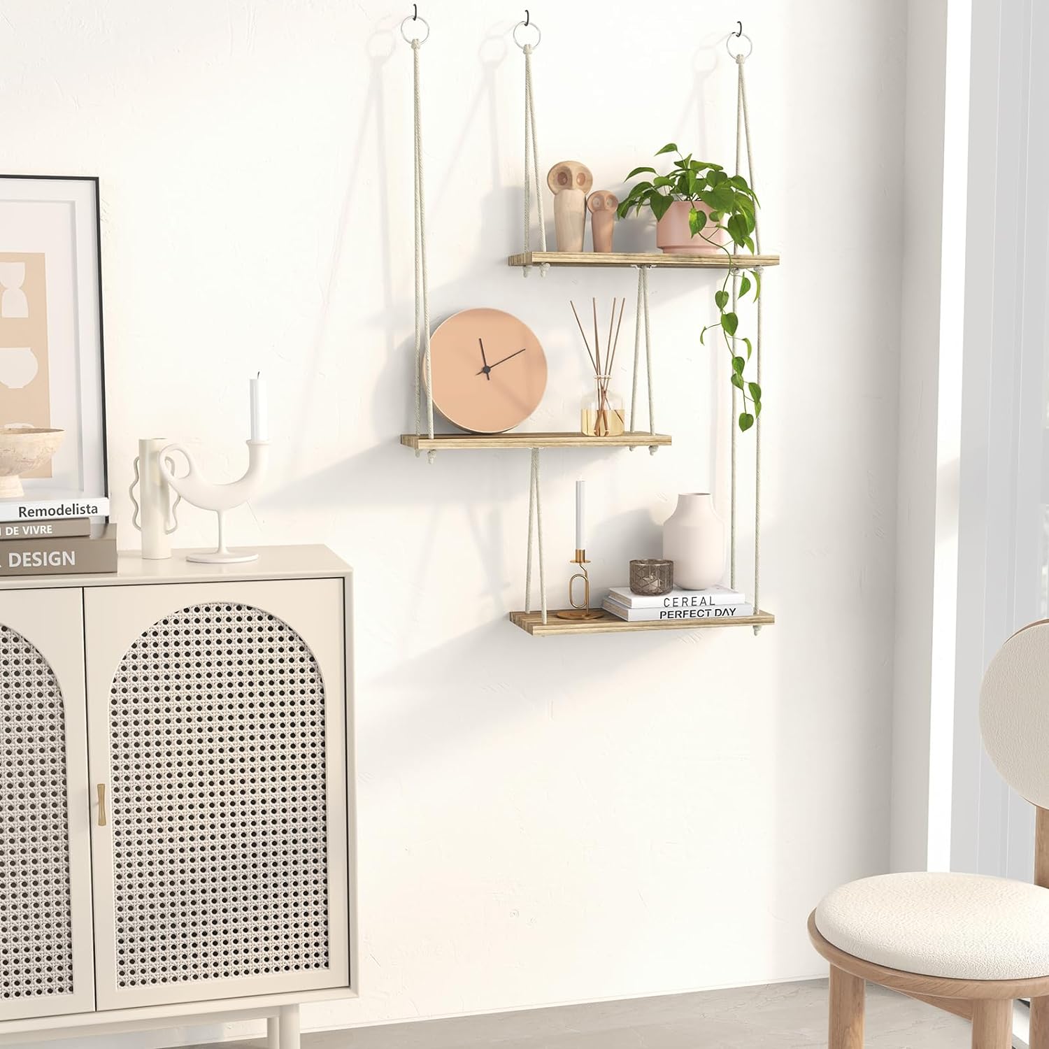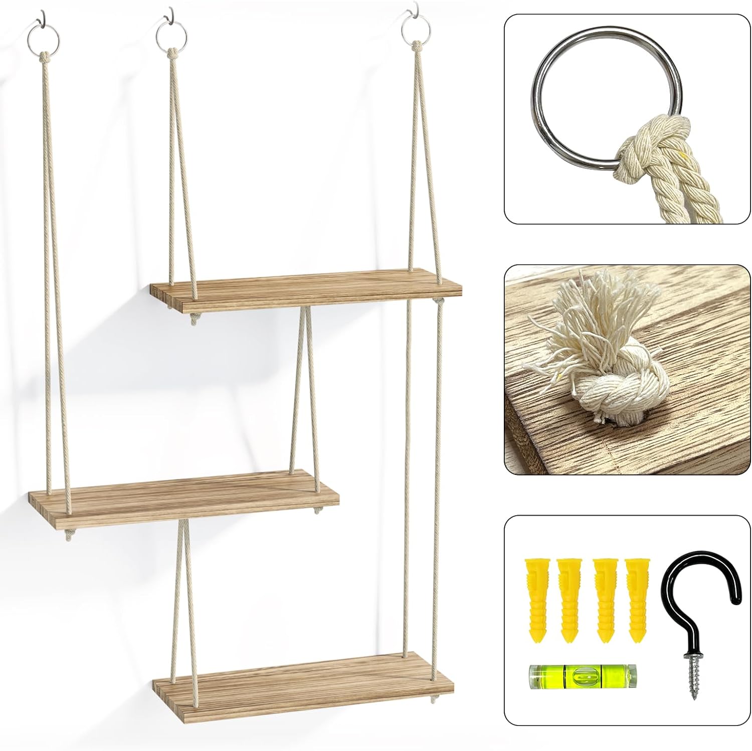 - [Perfect Home Decoration] - A Macrame floating shelf is a beautiful and practical way to decorate your home. It can hold collectibles, photos, books, and plants, which is suitable for bedrooms, living rooms, bathrooms, kitchens, nurseries, dormitories and offices. Our 3-tier boho-chic hanging shelf can be used in many decor styles, such as farmhouse, southwestern, bohemian, modern, rustic, minimalist, etc.