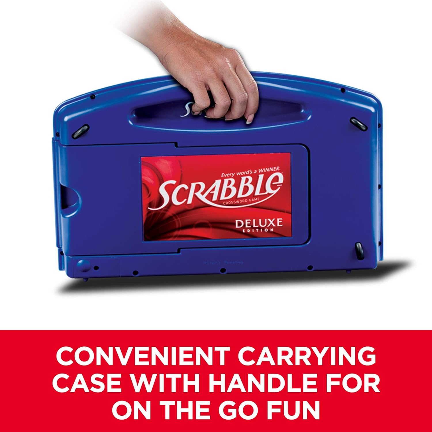 - Includes deluxe carrying case with Scrabble gameboard and two slide-and-store trays, 100 wooden letter tiles, 4 deluxe curved tile racks, plush drawstring letter pouch and gameplay guide