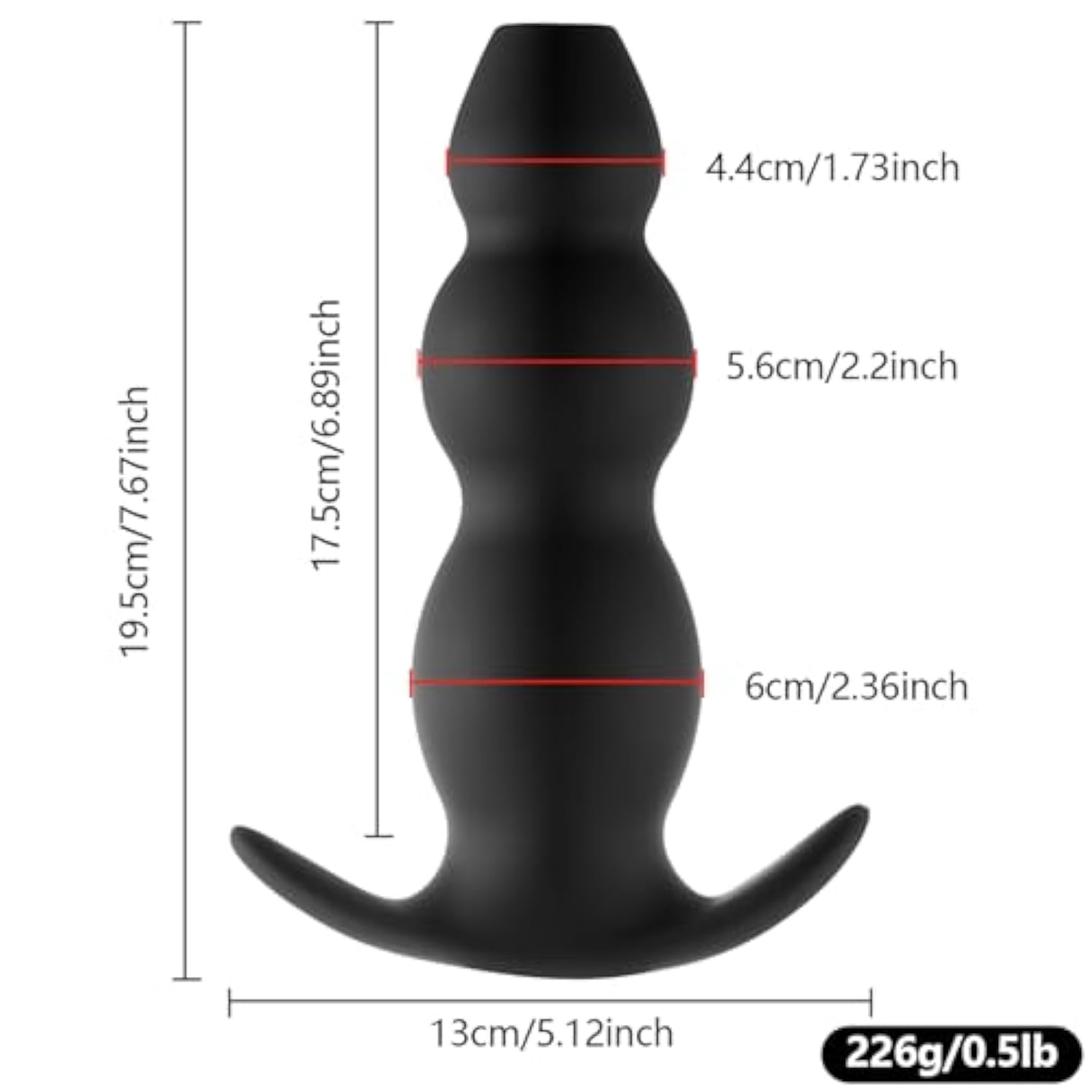 | Black Huge Anal Plug - Size L: Overall Length 7.67'', Overall Width Length 5.12'', Insertable Length 6.89'', Widest Insertable Diameter 2.36''. This Butt Plug Weighs 0.5Lb, With The Narrow Flared Base, And Three Hollow Spheres Of Different Diameters(1.73'', 2.2'', 2.36''). Different-Size From The Top To The Bottom, Offers A Full And Satisfying Sensation For Those Who Enjoy Sex And Fun. Its Length And Girth Provide Ample Stimulation. Not Only Sex Toy For Women, But Also For Men, Gay, Lesbians, Couples. | | Hollow Design For Staying Power - The Narrow Flared Design Locks This Plug In Place When Inserted, Not Easy To Slide Out. Perfect For People Who Want A Satisfying Fill And Stretch Without An Uncomfortable Entry. Inject Into Water To Wash Anal Or Vagina, Keep Your Backyard Or Vaginal Clean And Healthy, Or Match Well With Bullet Vibrator, Try On Various Hole Play And Indulge Yourself In Earth-Shattering Stimulation. | | Body-Safe Silicone Material - This Anal Toy Is Made Of The Premium Silicone Material, Which Is Flexible; It Boasts A Smooth And A Significant Girth, Providing An Exciting And Challenging Experience For Beginners And Even The Most Advanced Anal Toy Users. The Length And Thickness Is Enough For Vagina Or Anal Deep Massage. Different-Size Designed For Better Anus Expand, Which Helps You To Reach The Orgasm You Desire. | | 100% Waterproof - Recommended Use It With Water-Based Lubricant For Better Experience. Or You Can Have Some Different Pleasure While You Taking Shower Or Siting On The Bathtub. After Use, It Can Be Cleaned With Soap Water Easily. | | Secret And Discreet Box Packaging - This Sex Toy Will Come In Secret And Discreet Box, Without Any Trace Of Sensitive Tags/Words To Protect Your Privacy. If You Have Any Question, Please