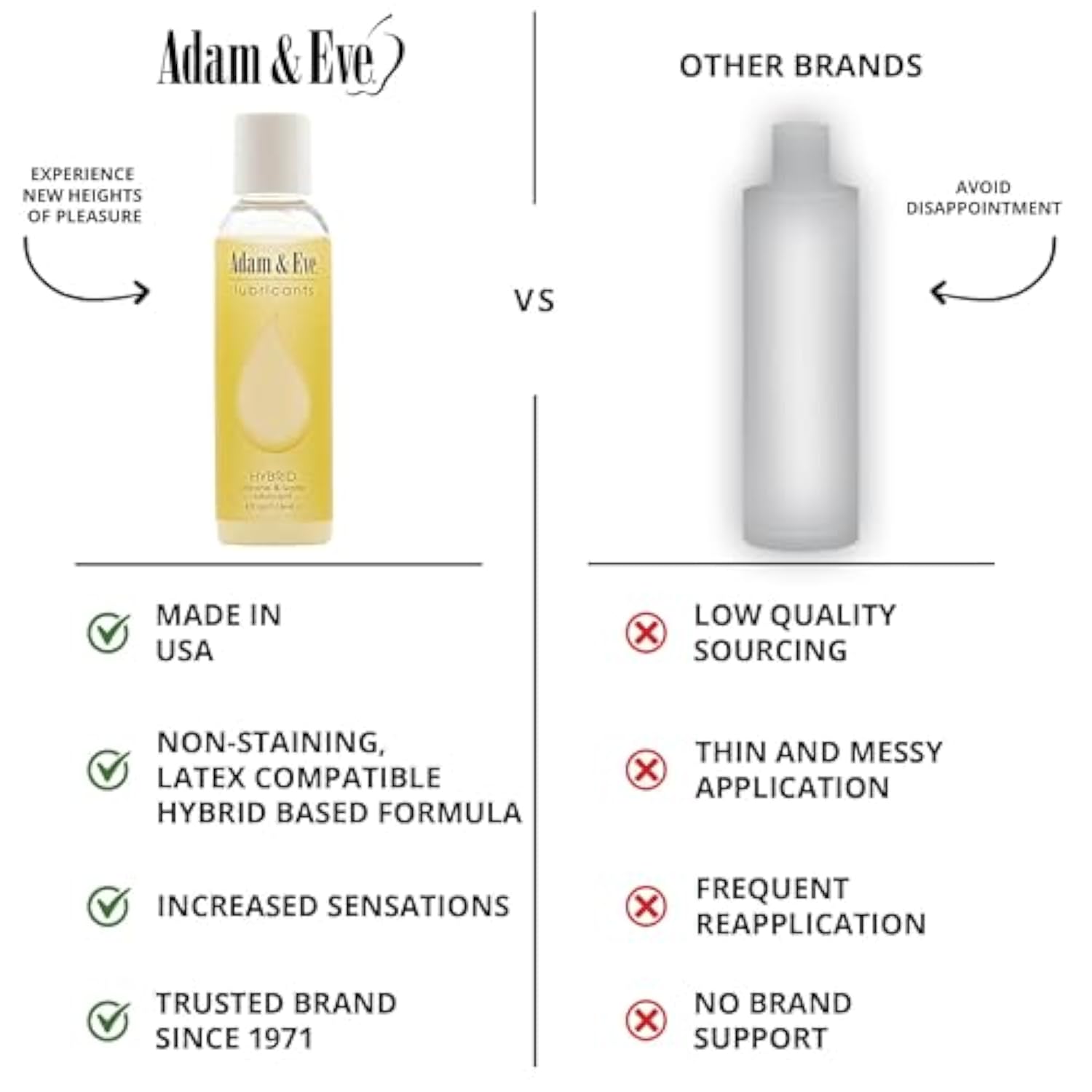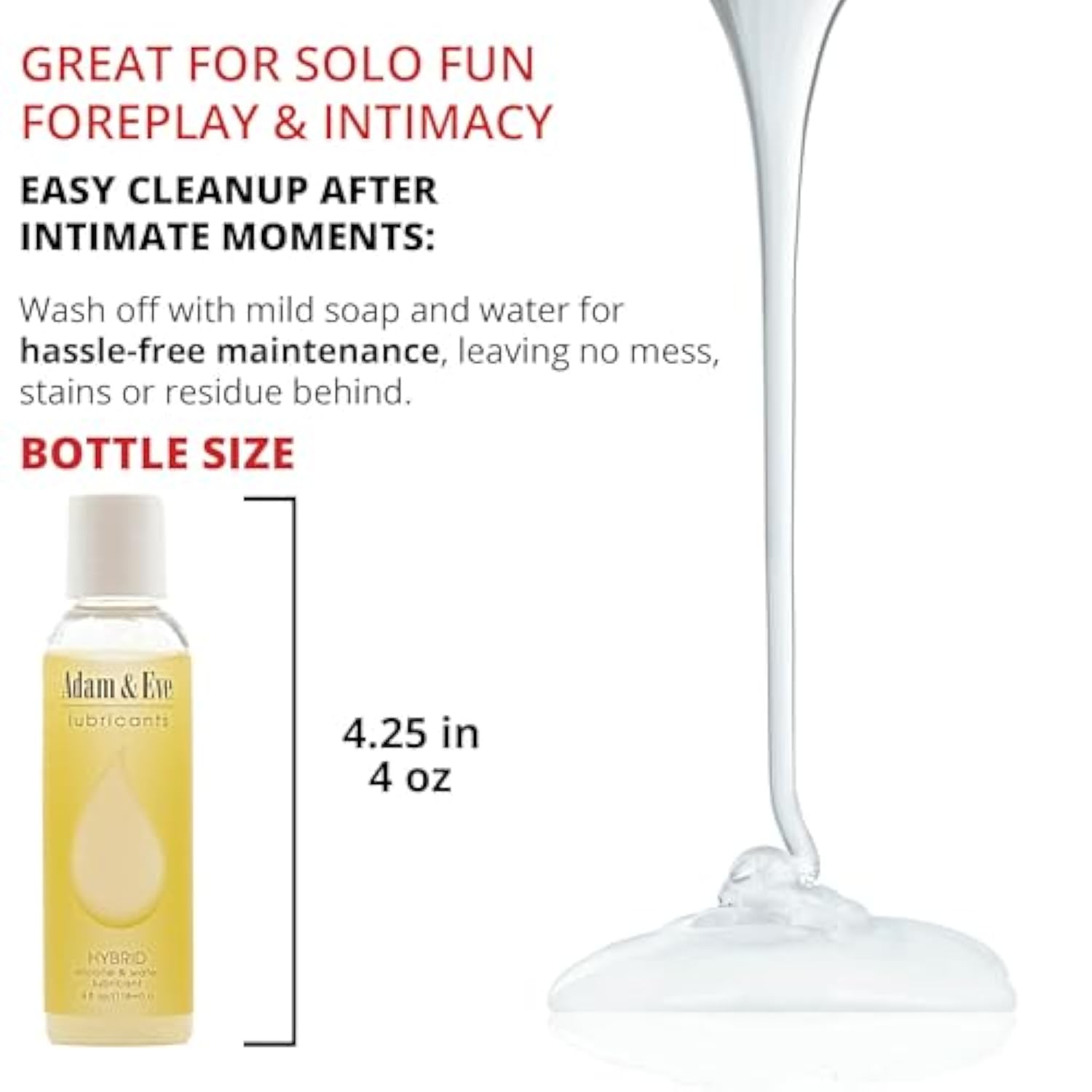 | Water And Silicone Blend For Long-Lasting Glide: Enjoy The Best Of Both Worlds With This Hybrid Lubricant. It Has The Silky, Long-Lasting Feel Of Silicone While Maintaining The Easy Cleanup Of Water-Based Lubes. Perfect For Intimate Pleasure, Enhancing Comfort And Reducing Friction | | Colorless, Odorless, And Non-Sticky Formula: This High-Quality Personal Lubricant Is Designed For A Natural Feel, Free From Artificial Fragrances Or Dyes. Its Lightweight, Silky Texture Glides Smoothly Without Feeling Greasy Or Sticky, Making Every Experience More Pleasurable | | Safe For Condoms And Non-Silicone Toys: Compatible With Latex And Polyisoprene Condoms, This Versatile Lube Is Ideal For All Types Of Intimacy. Safe To Use With Non-Silicone Sex Toys, It Enhances Pleasure While Maintaining The Integrity Of Your Favorite Accessories | | Glycerin And Paraben Free For Sensitive Skin: Formulated With High-Quality, Body-Safe Ingredients, This Lubricant Is Gentle On Delicate Skin. Fda-Cleared And Designed For Ultimate Comfort, It’S A Must-Have For Solo Play, Couples, And Anyone Looking For A Premium Lube Experience | | Trusted Usa Brand Since 1971, Adam Eve Is Committed To Providing High-Quality Lubricants And Superior