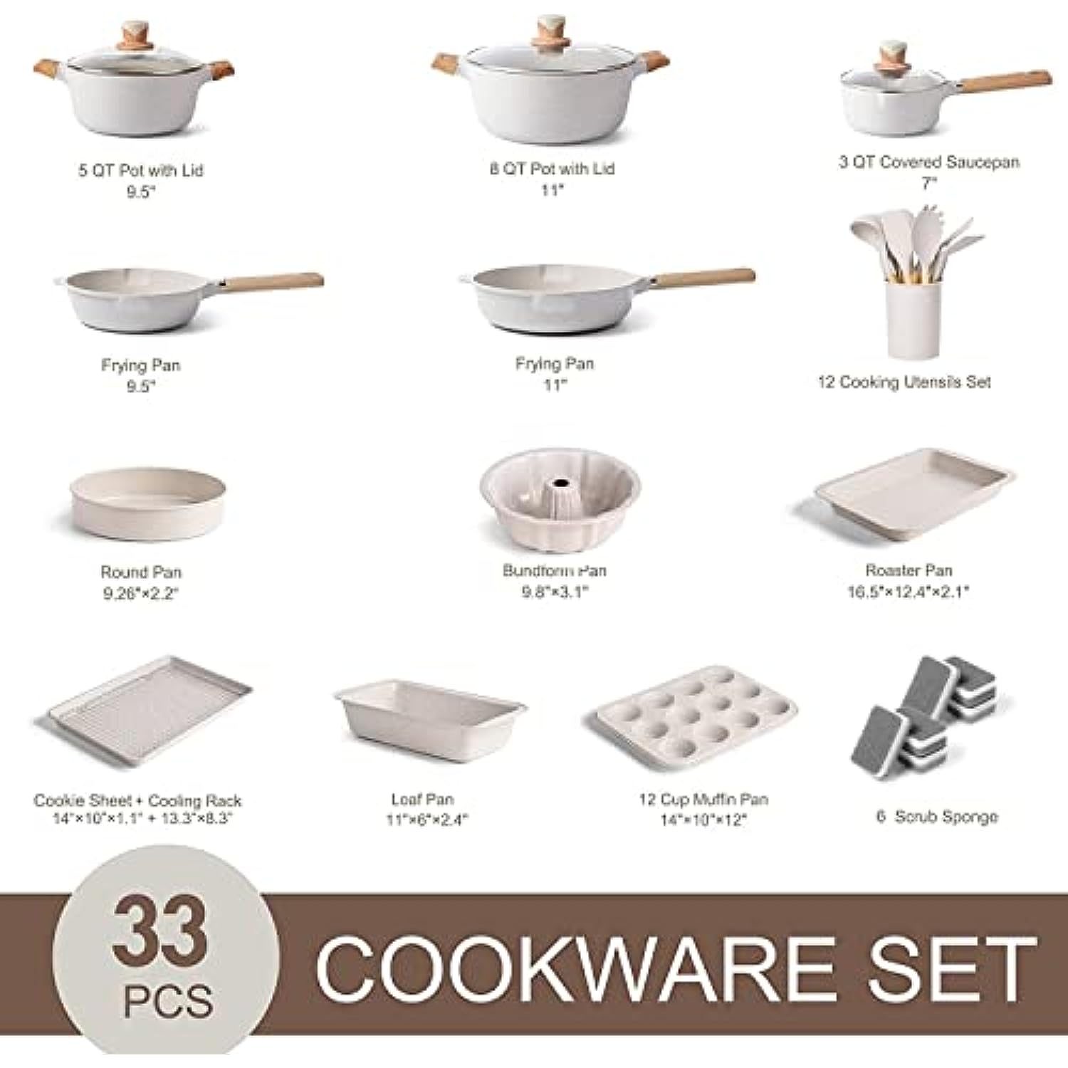 • Healthy Nonstick Pans and Pots Set: - The 33 piece kitchen pots and pans include a 9.5” frying pan, an 11" frying pan, a 5QT stockpot with lid, an 8QT stockpot, a 3QT saucepan with lid, 11 Kitchen utensils set, a storage bucket, a boundform pan, a round pan, a cookie sheet, a roaster pan+cooking pack, loaf pan, muffin pan and six sponges. The stylish cookware sets meet all your kitchen and family needs.