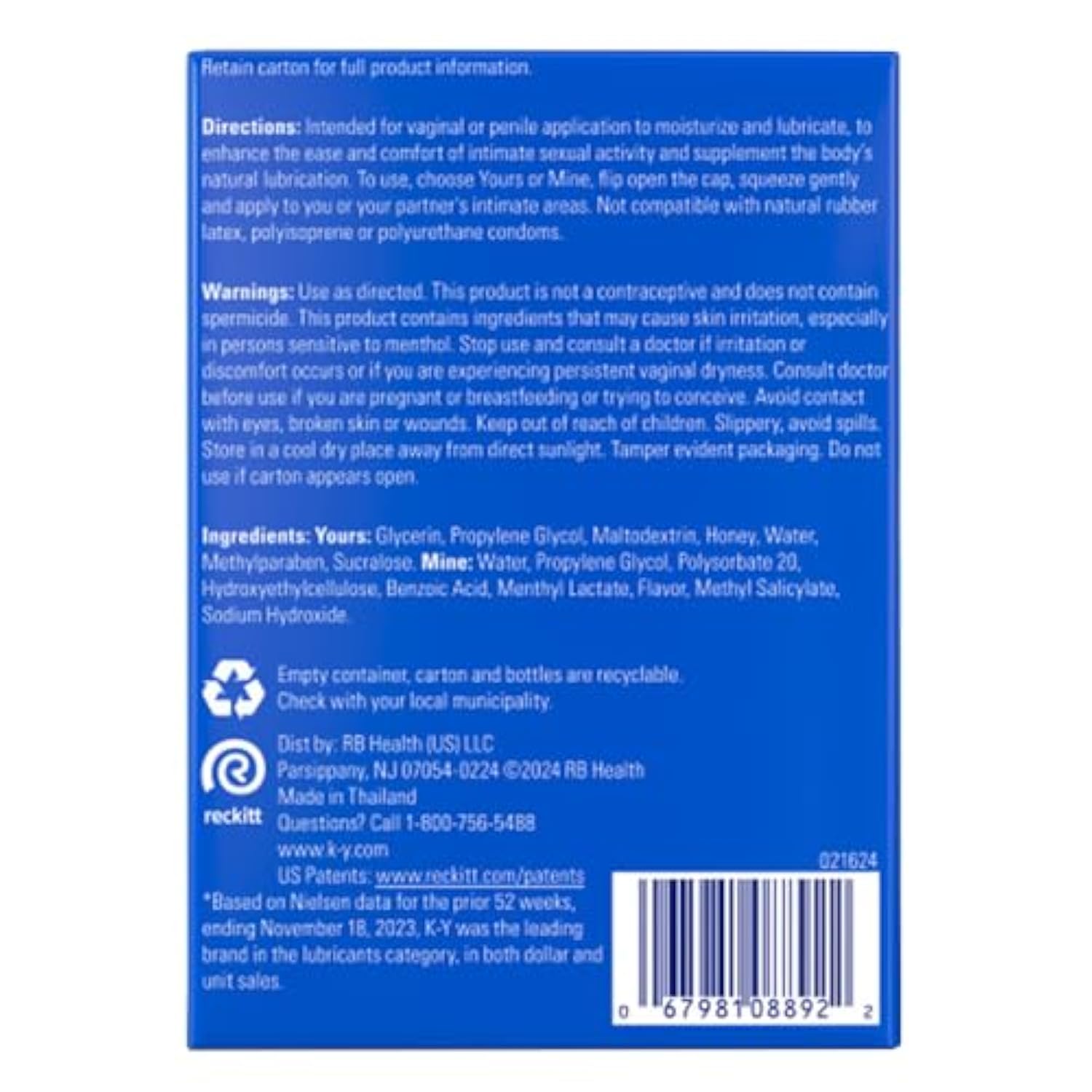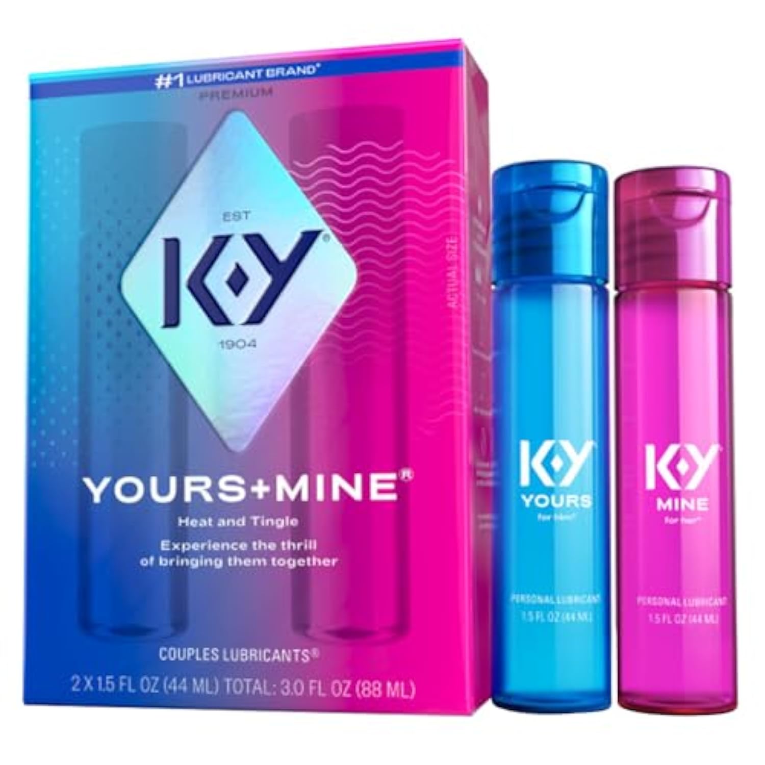 | ?PERSONAL LUBE FOR SEX: K-Y Yours + Mine couples sex lube is designed to help keep the excitement coming with two personal lubricants that combine to help ignite much more than conversation | | ??WATER BASED LUBE FOR WOMEN: KY "Mine" is a water based lubricant with a thrilling, tingling sensation for her | | ?? GLYCERIN BASED WARMING LUBE FOR MEN: KY "Yours" is a glycerin based warming lubricant with an invigorating, warming sensation for him | | ??COUPLES SEX LUBRICANT ENHANCES INTIMACY: Put these 2 sensation lubricants together for a totally new exciting intimate experience;night just got a whole lot hotter! | | ?? SEX TOY LUBE: These couples lubricants are suitable to use with sex toys for couples; They are not compatible with condoms; For condom-friendly lubricants, check out other KY lubricants such as KY Intense Gel, KY Warming Jelly, KY Silicone lube | | ??KY LUBE HELPS SPICE UP THE BEDROOM FOR COUPLES: KY Yours + Mine couples sexual lubricants are designed to help keep the excitement coming; These two personal lubricants combine to ignite much more than conversation - Now we're talking | | ??NON-STAINING PERSONAL LUBRICANT FOR SEX: Worried about the aftermath Don't be! These exciting lubes are non-staining and easy to clean, so you are free to explore without the dreaded clean-up | |