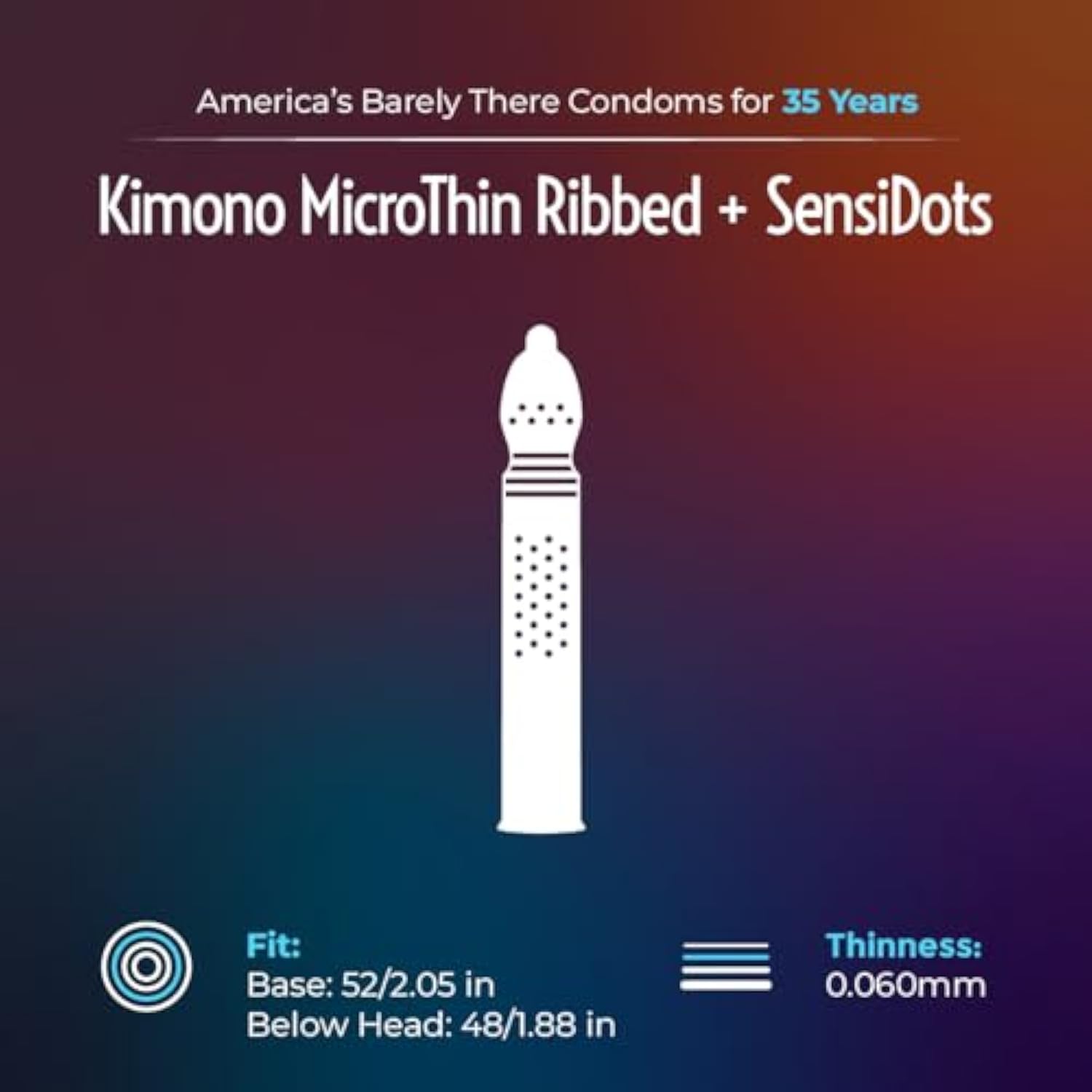 Kimono MicroThin Ribbed with Sensi-Dots Pack of 12 - Textured Lubricated Condoms, Snug Form-Fit, Natural Latex, Vegan-Friendly, No Latex Odor - Enhanced Sensitivity