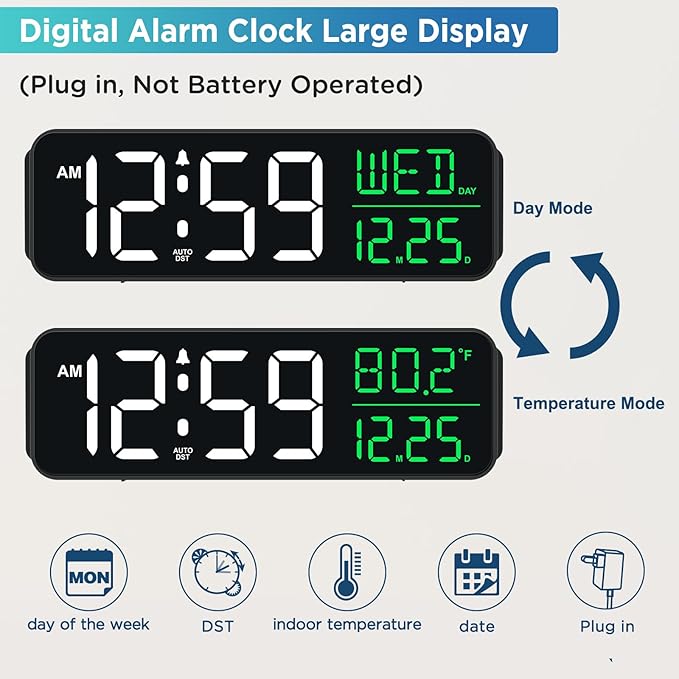 - ๐๐ข๐ ๐ข๐ญ๐๐ฅ ๐๐ฅ๐๐ซ๐ฆ ๐๐ฅ๐จ๐๐ค ๐ฐ๐ข๐ญ๐ก ๐๐ฎ๐ญ๐จ ๐๐๐๏ผImagine never having to manually adjust your clock for Daylight Saving Time again. With auto DST, your digital alarm clock seamlessly transitions between standard and Daylight Savings Time, ensuring you're always in sync with the official time change.
